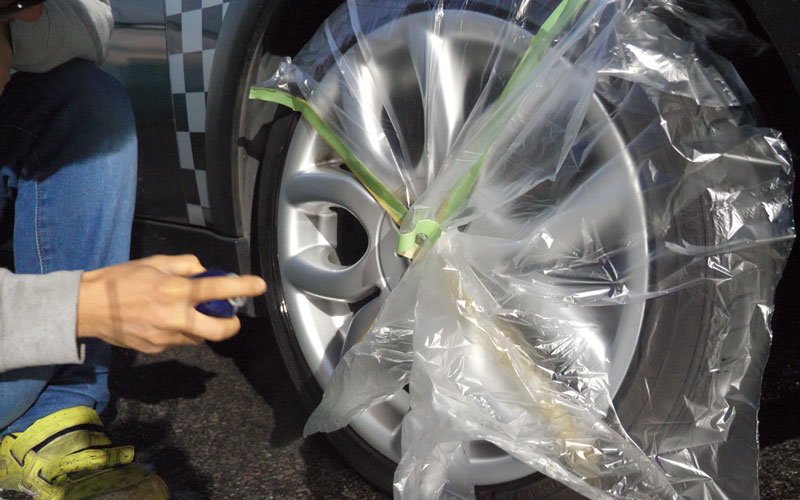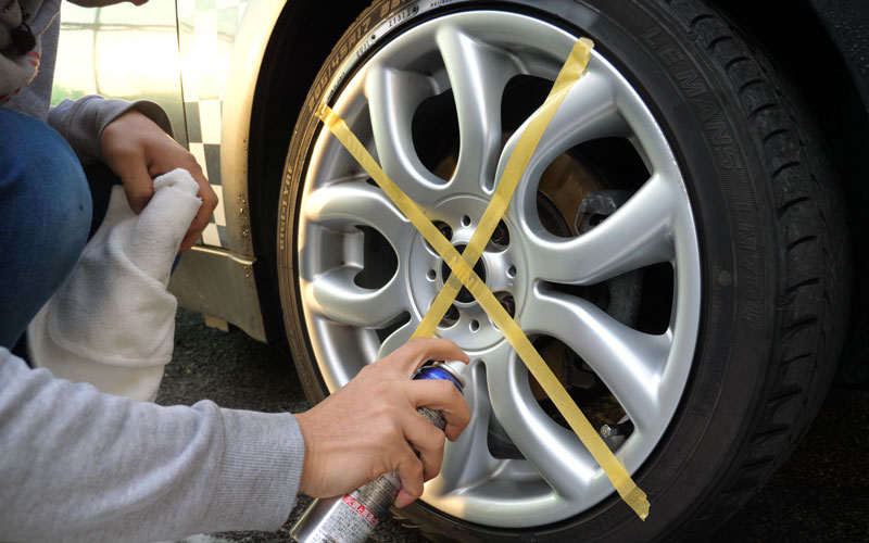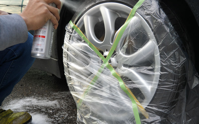 3.容器を良く振って、ホイール全体に均一に適量噴霧します。