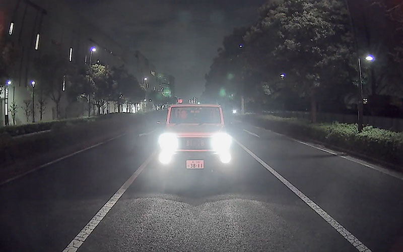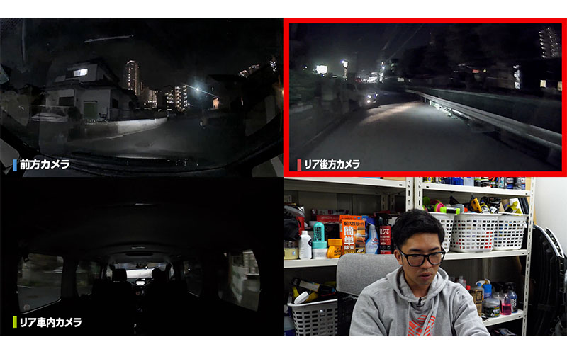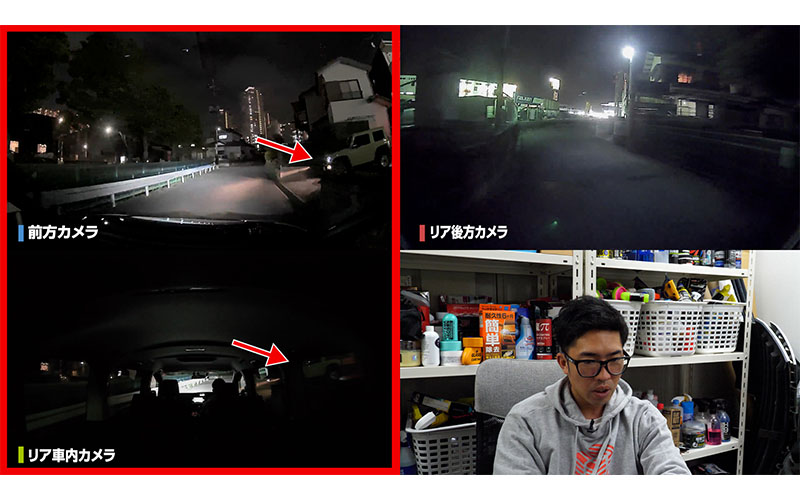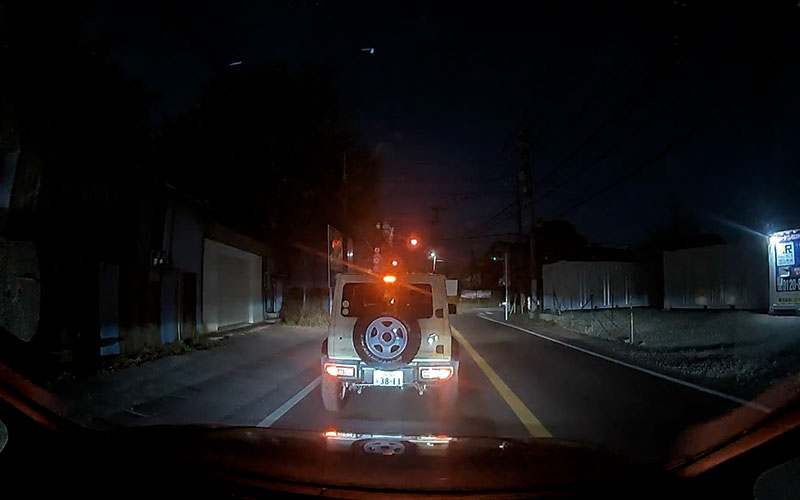 やはり暗いのでナンバーの認識がしづらいですが、前方カメラに映らなくなったジムニーシエラもリア車内カメラで捉えられています。