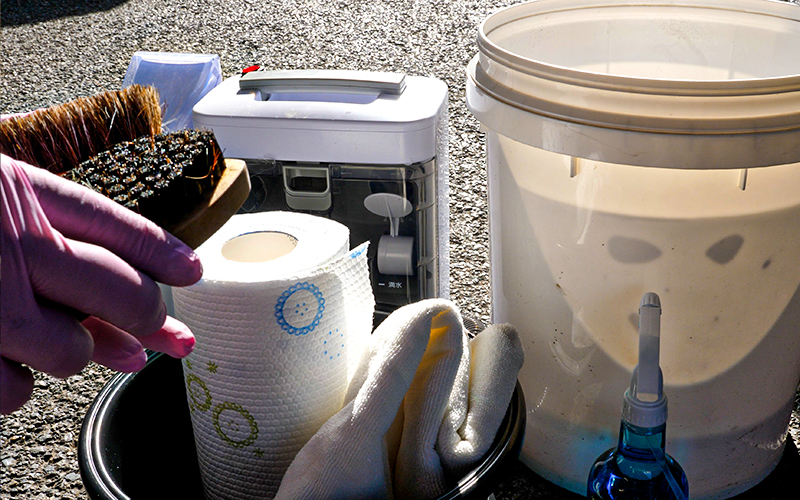 特にクロスは頻繁に綺麗にしながら作業してください。汚れているのも布、汚れを吸い取るのも布。綺麗な方に汚れが移っていくのを利用するため、クロスが綺麗でなければいけません。ブラシも含めて定期的にバケツで水洗いしましょう。