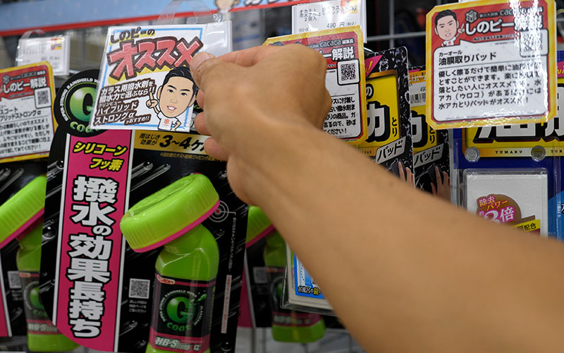 しのピー:今オススメの商品にポップつけてるんだけど、例えば『水アカとりパッド』。これは撥水剤を使う前に使う下地処理剤になります。