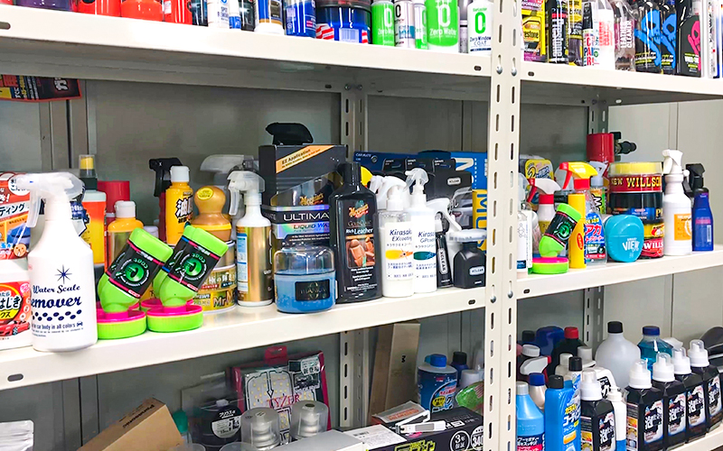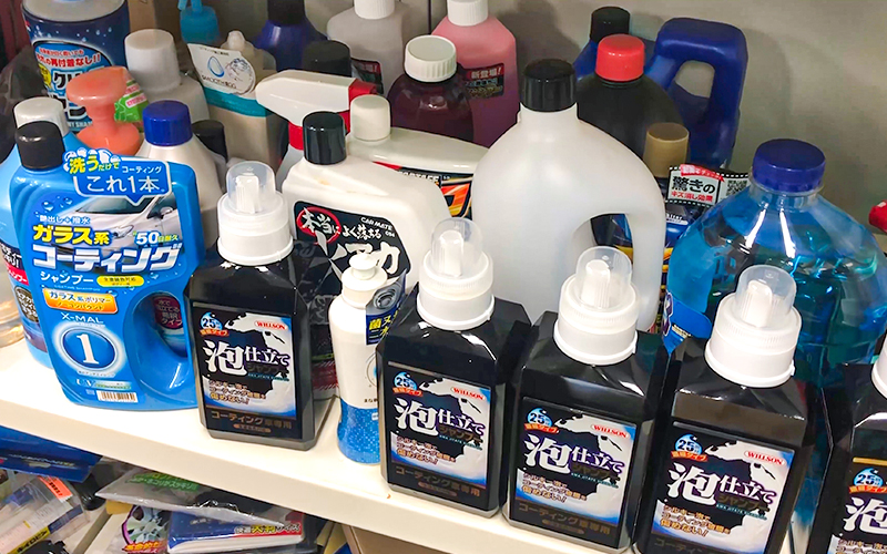 昔は「コーティング剤」「カーシャンプー」「撥水剤」など、ジャンルごとにまとめて置いていたのですが、それだと分かりづらいので今はメーカーごとに並べています。