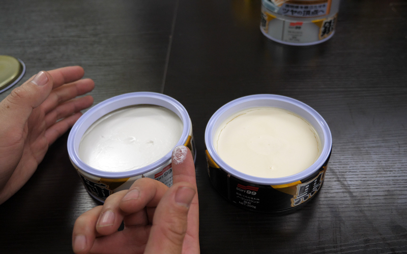 白い車用のワックスはコンパウンドっていうのが入っていることが多いです。逆に黒い車用のワックスはノーコンパウンドのことが多いです。もちろん例外もあります。