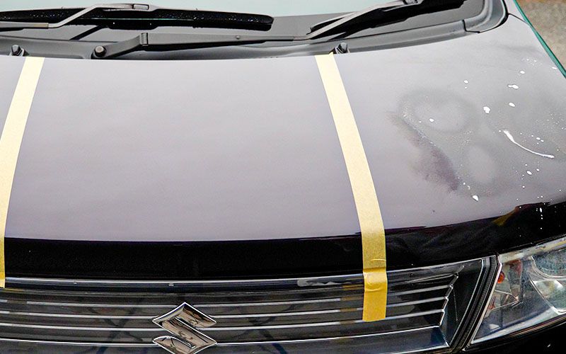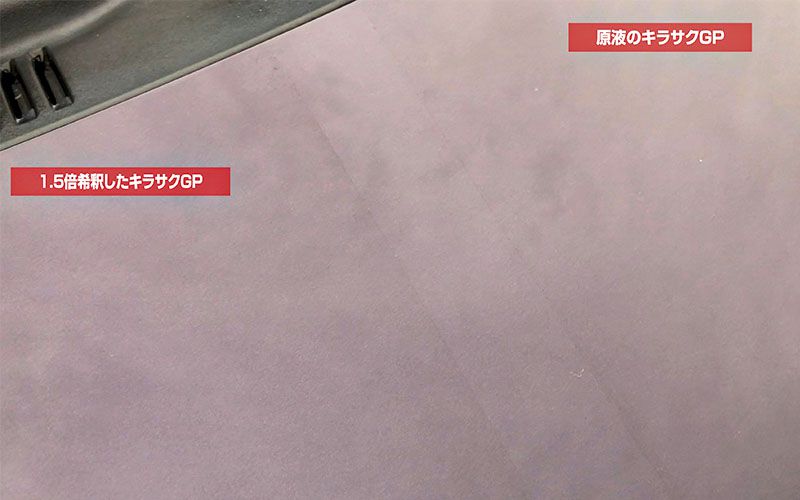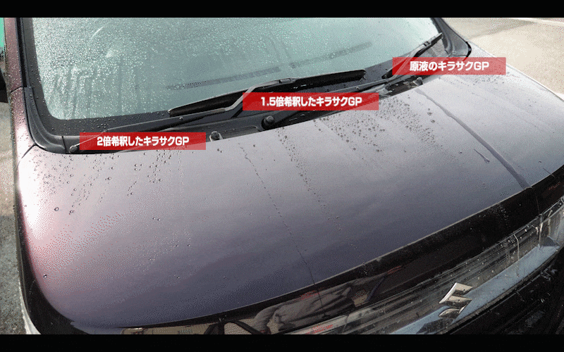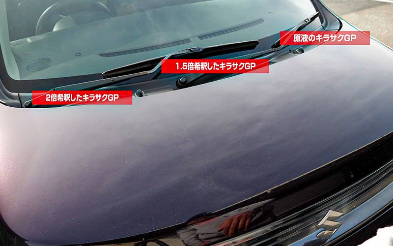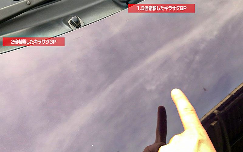 マスキングテープで3等分して右が通常の『キラサクGP』、真ん中が1.5倍希釈の『キラサクGP』、左に2倍希釈の『キラサクGP』を施工していきます。