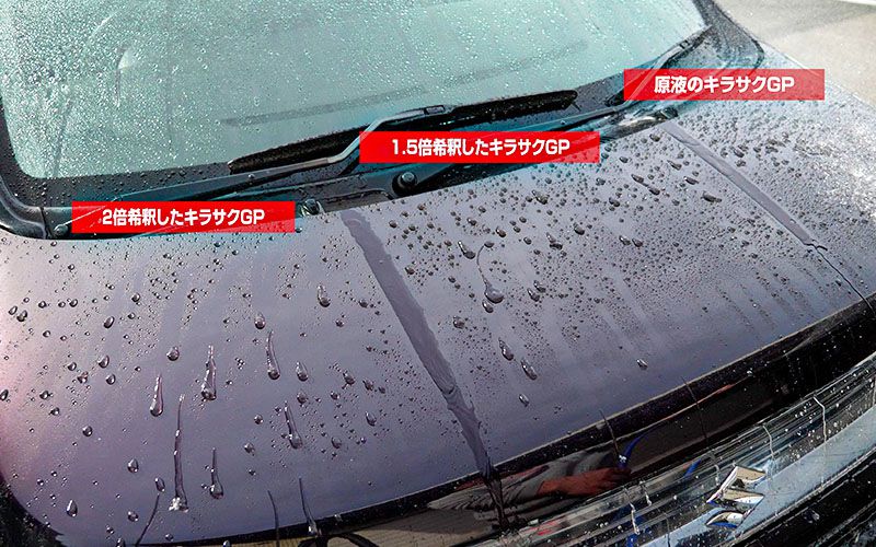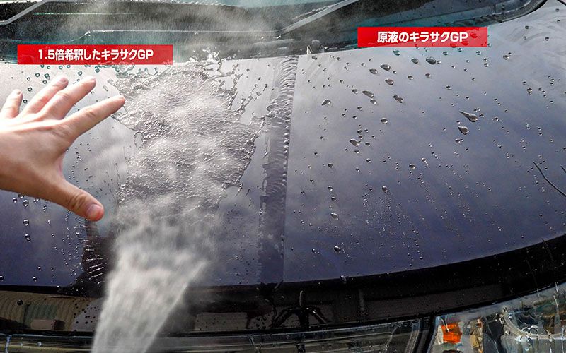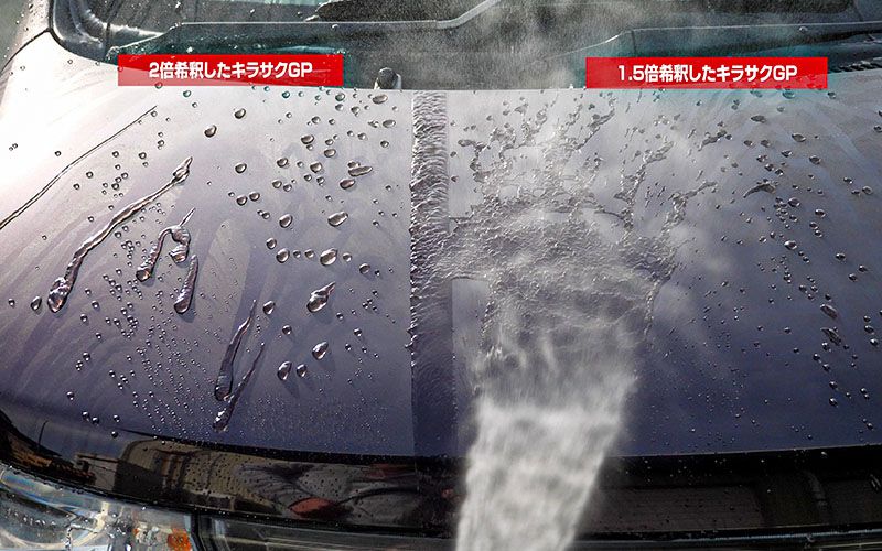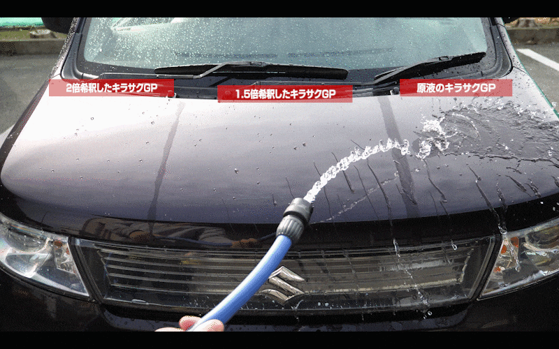 艶には大きな違いがありましたが、撥水力はほとんど変わらず、点数を付けるなら原液10点、1.5と2倍希釈は9点といった感じです。