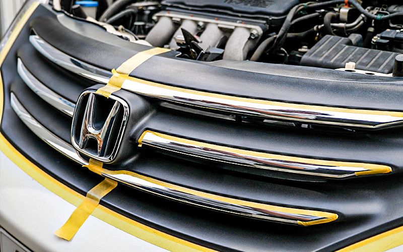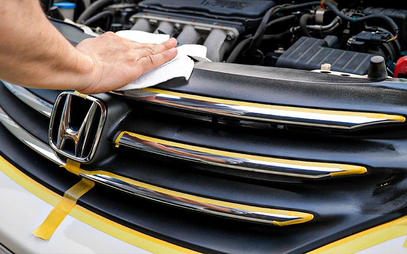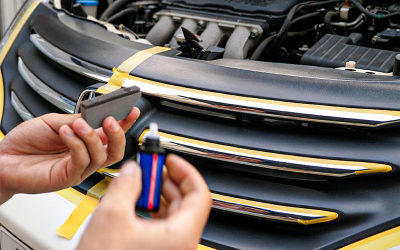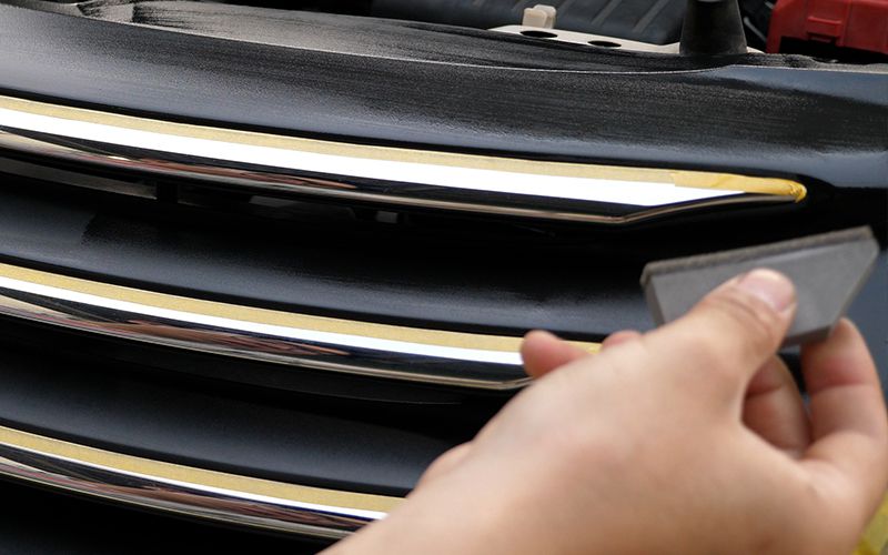 今回は、このフロントグリル部分。未塗装樹脂が白っぽくなっているのでここに施工してみたいと思います。使用方法は次の通りです。
