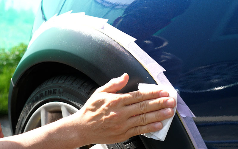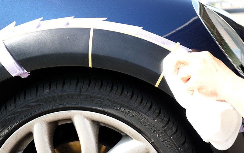 マスキングテープを貼らないと塗装面にコーティング剤が付いてしまうのでマスキングテープは貼った方がいいです。裏側とか細かい所も乾く前に拭いていきます。