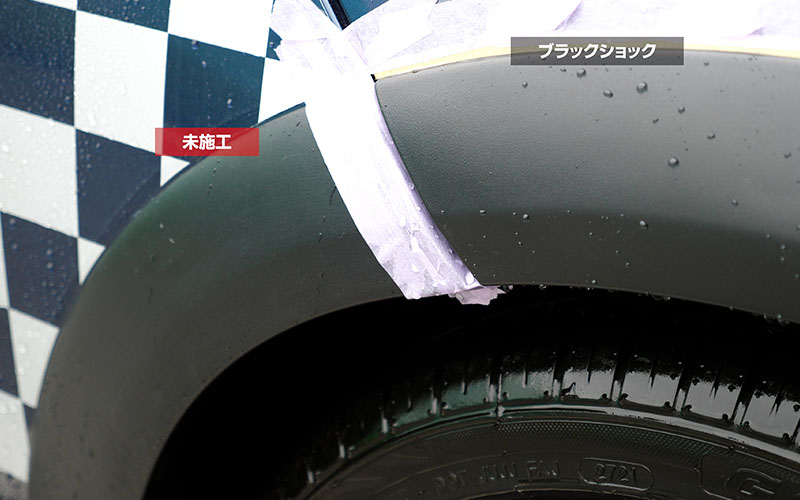 マスキングテープより右側が『ブラックショック』で左側が未施工です。『ブラックショック』弾いてますね。それで未施工の方は水弾きがありません。