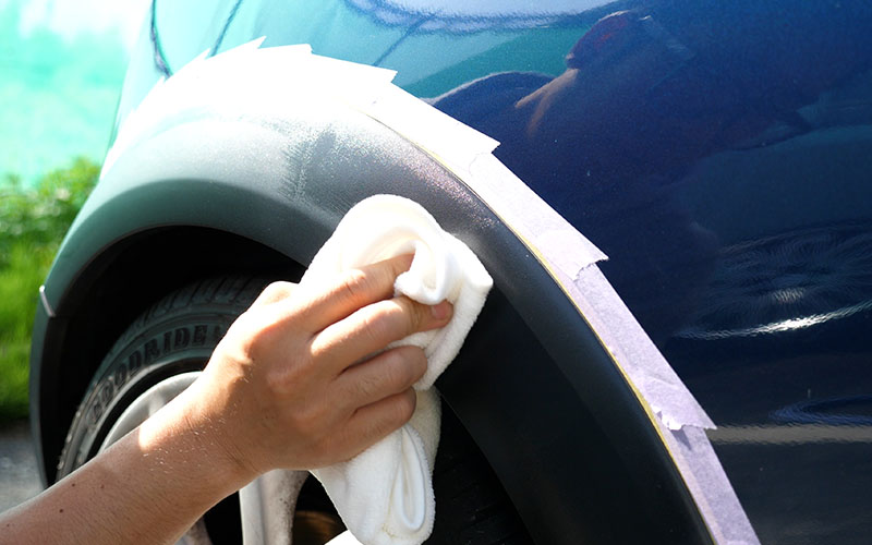 ※内溶液を取る際はボディなど対象面以外に付着しないように注意してください。4.塗布後、すぐに2で用意したクロスでなでるようにやさしく拭き、表面をならしてください。