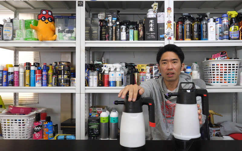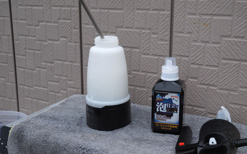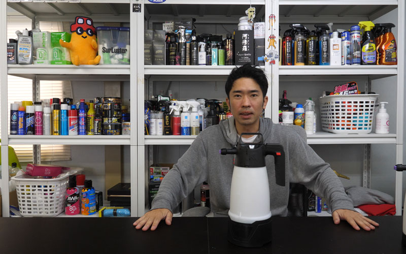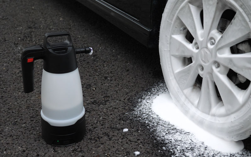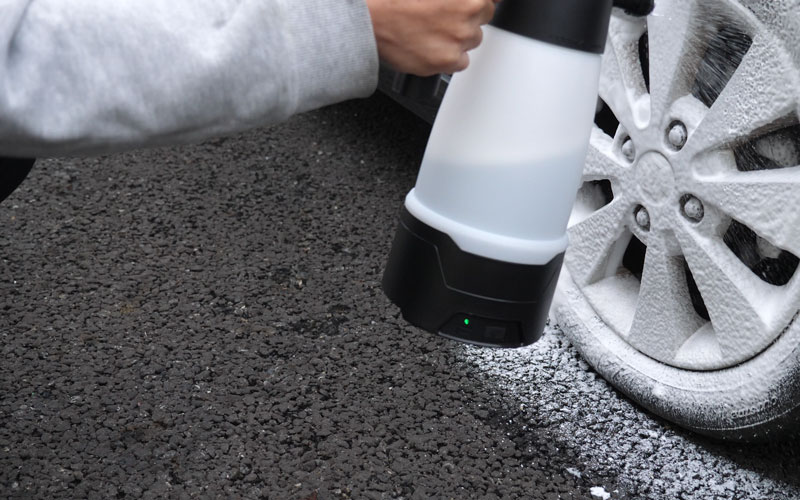 どちらも蓄圧式のフォームスプレーで、ポンピングすることで泡を噴射できるというアイテムなんですが、今回使用する「e FOAM Pro 2」はちょっと背が高め。その理由は…なんとバッテリーを内蔵した電動タイプなんです!
