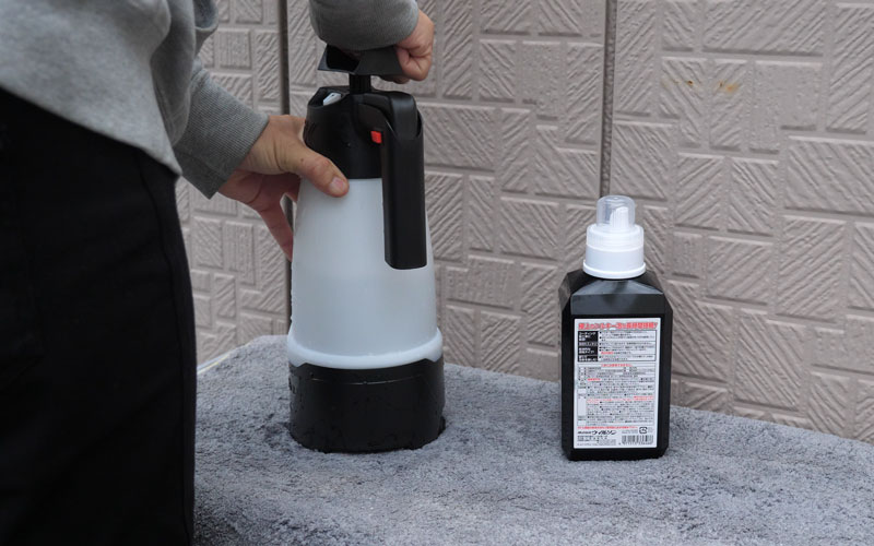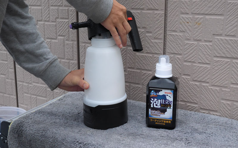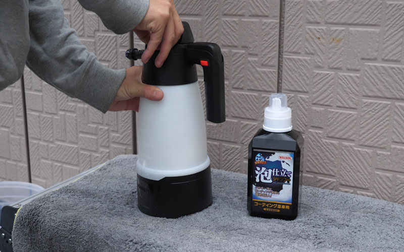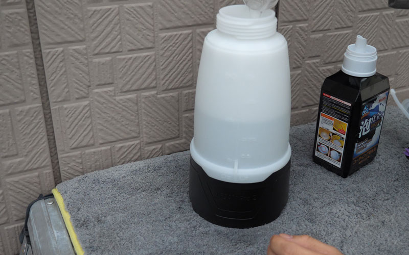 タンクにはリッター表記があるので、まず1リットルの水を入れましょう。この辺りまでかな。そしてここにカーシャンプーを加えます。