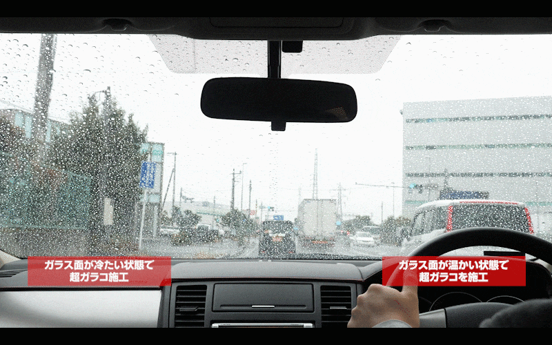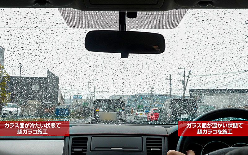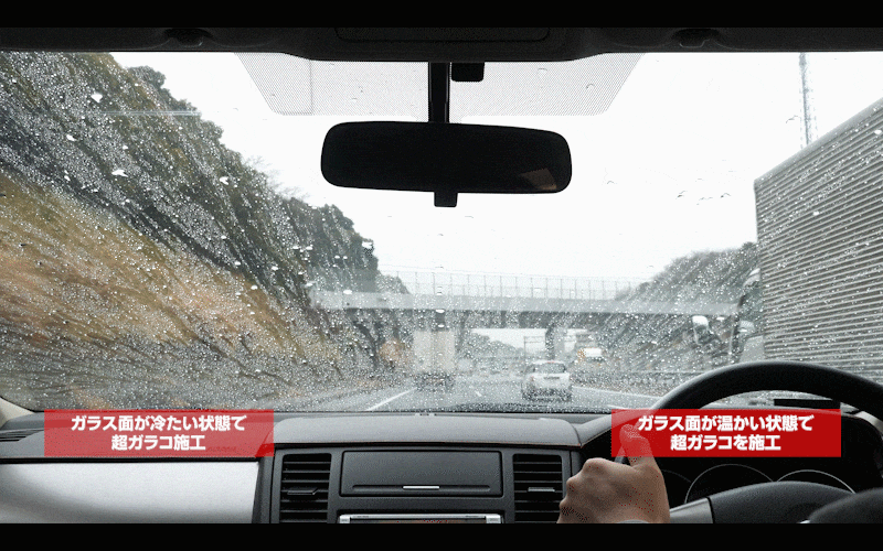 フロントガラスの半面は暖房を付けてガラス面を温めた状態、もう半面は冷えた状態でソフト99『超ガラコ』を施工して、水弾きにどのような違いが出るのかという検証です。
