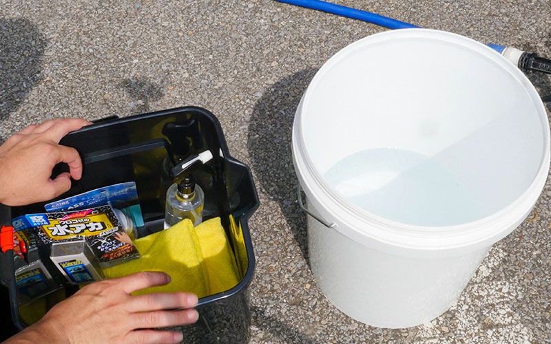 水道があれば一気に洗い流しても大丈夫ですが、その時に飛び散った液剤がボディについて洗車すると傷付いてしまう可能性あるので、しっかりと洗い流してあげてください。