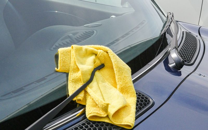 ブレードを外した後にそのまま立てておくとアームが倒れてきてガラスが傷付いてしまう可能性があるので、ガラスとアームでタオルを挟むようにして倒しておきます。