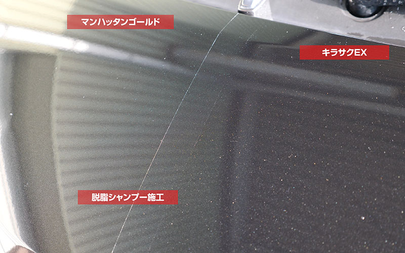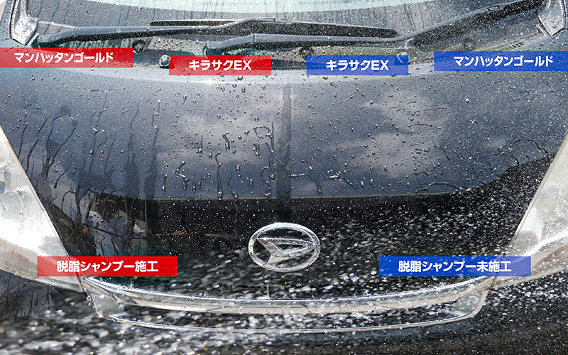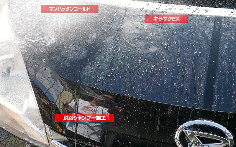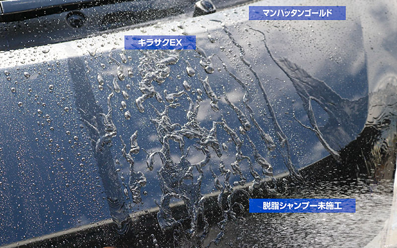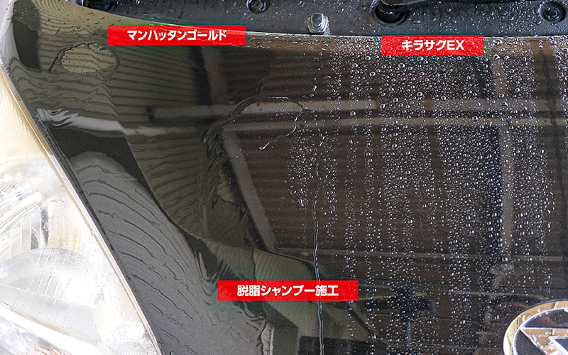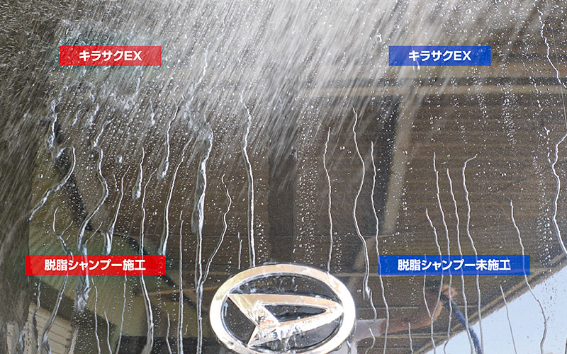 水をかけた感じ、『キラサクEX』の撥水力すごいですが、『脱脂シャンプー』施工面と未施工面での差はなさそうです。