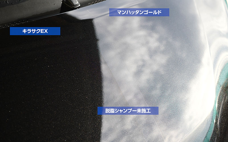 パッケージに「コーティング剤やワックスの効果を200%アップさせます」と書いてあったので、ボンネットの半面だけ『脱脂シャンプー』を施工して、全面に簡易コーティング剤とワックスを施工し、違いが出るのか検証をしました。