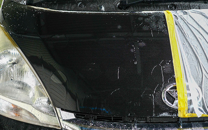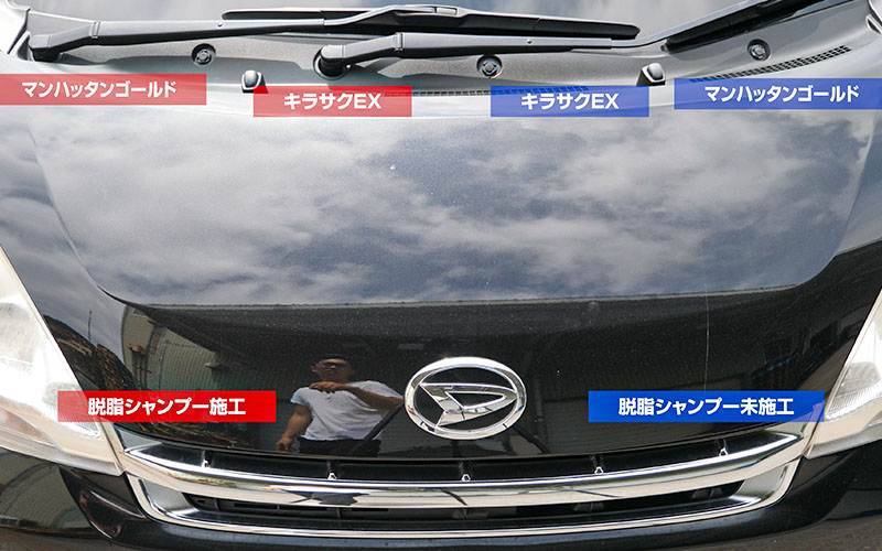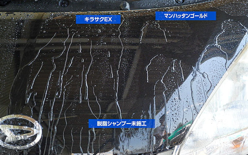 200%アップするのは撥水力なのか耐久性なのかわからないので、ボンネットの半面だけに脱脂シャンプーを施工後、全面にワックスを施工して違いが出るのか見ていきたいと思います。