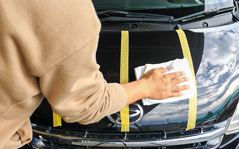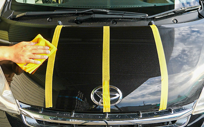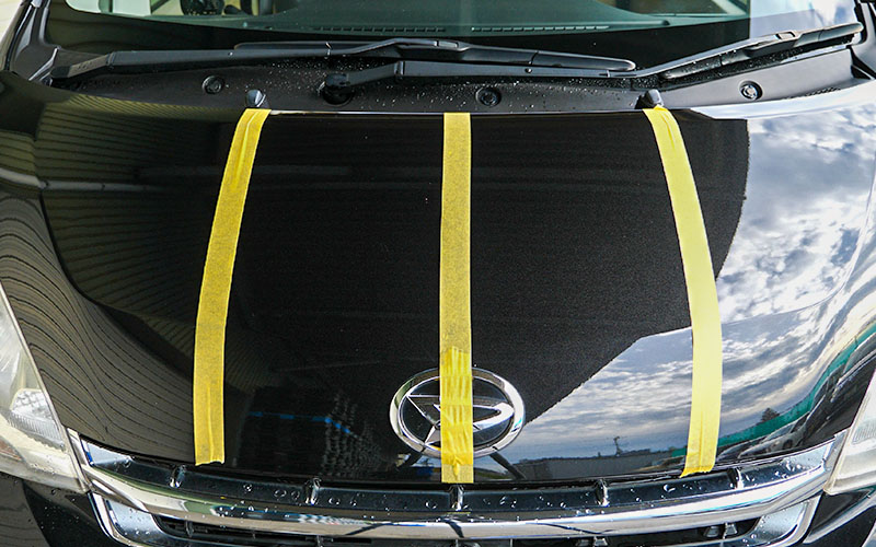 ボンネットをマスキングテープで4等分しました。本当はワックスだけを施工しようと思ったのですが、せっかくなので簡易コーティング剤も施工します。