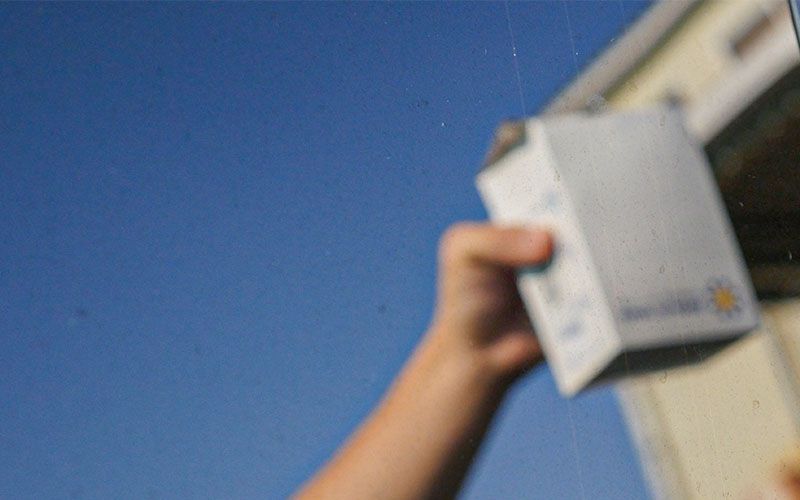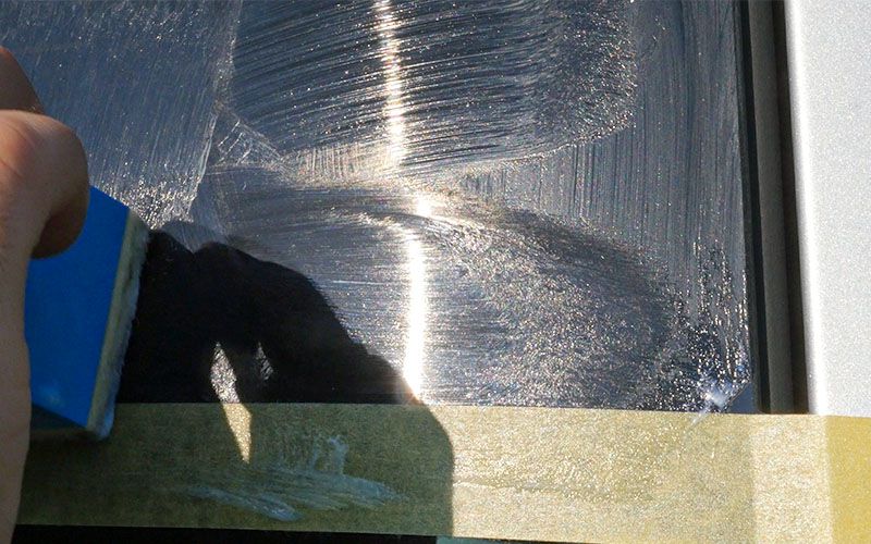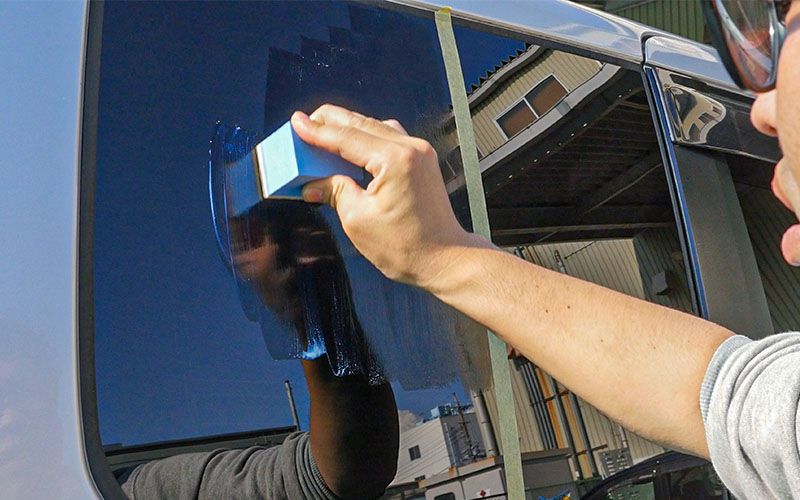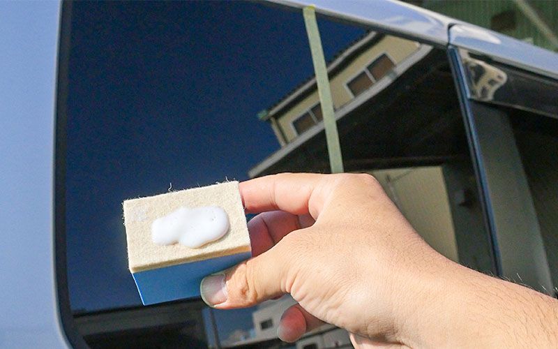 液剤をよく振って、スポンジに付けます。サイドガラスは2~4分割で施工とのことなので、2分割でやっていきます。