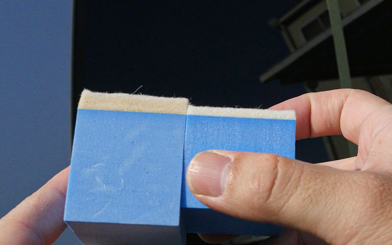 『油膜クリン』の付属スポンジですが、最初は『ウィンドウクリスタル』と同じものかと思いましたが、比べてみると厚さが若干違いました。