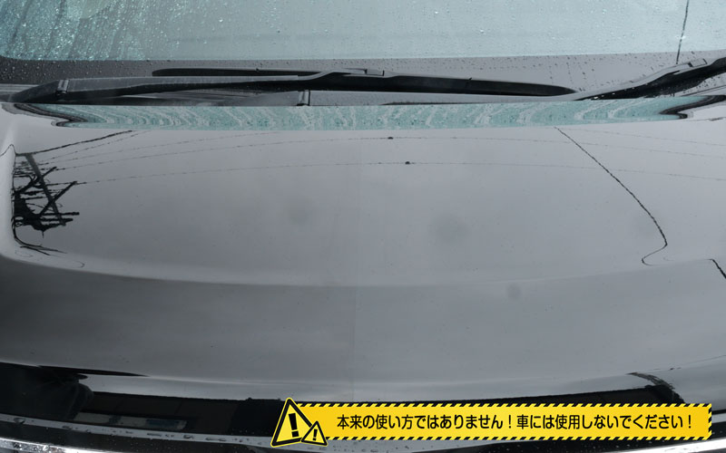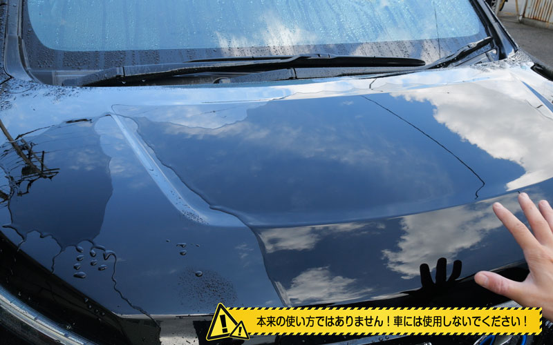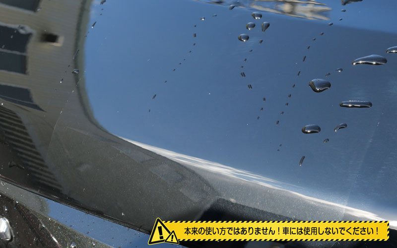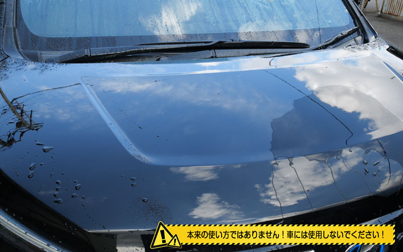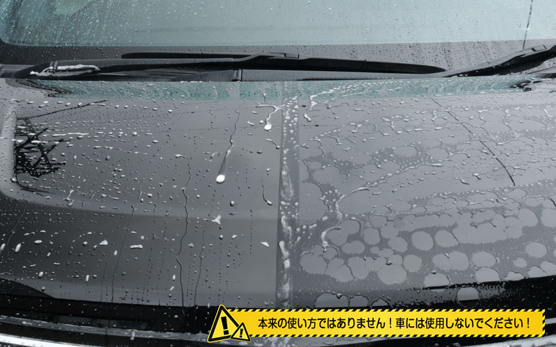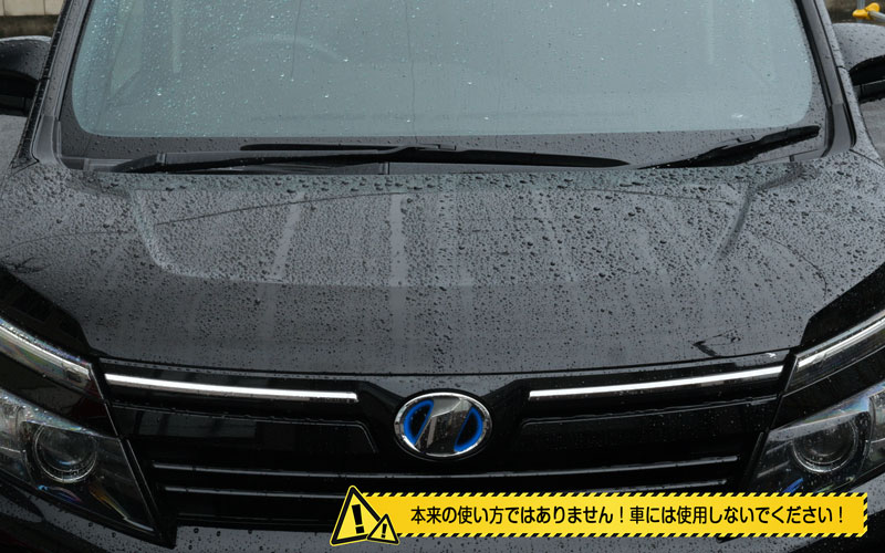 そしたら外にやってきました。今回は80VOXYのボンネットでテストしていこうと思います。もう水をかけちゃったんですが、現状としてはこんな感じで水弾きはありません。