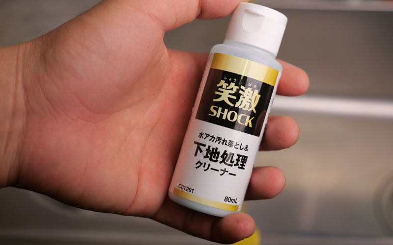 笑激SHOCK『水アカ汚れ落とし&下地処理クリーナー』これで水アカとかを落とせるみたいなので、一旦水アカを落としていきます。