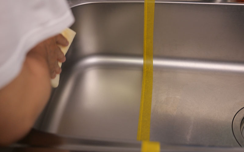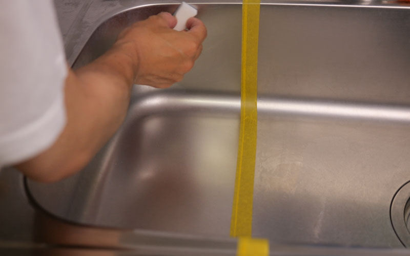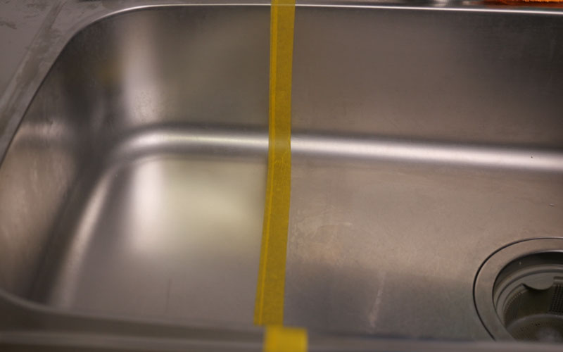 そうしたら実際にシンクでも試してみようと思います。マスキングテープを貼ったので左側にシンク・洗面台用のコーティング剤を施工していこうと思います。