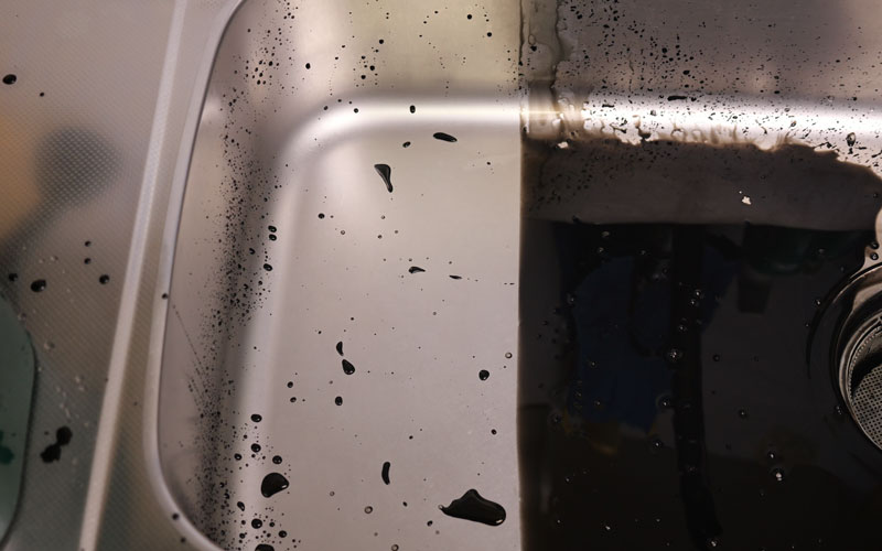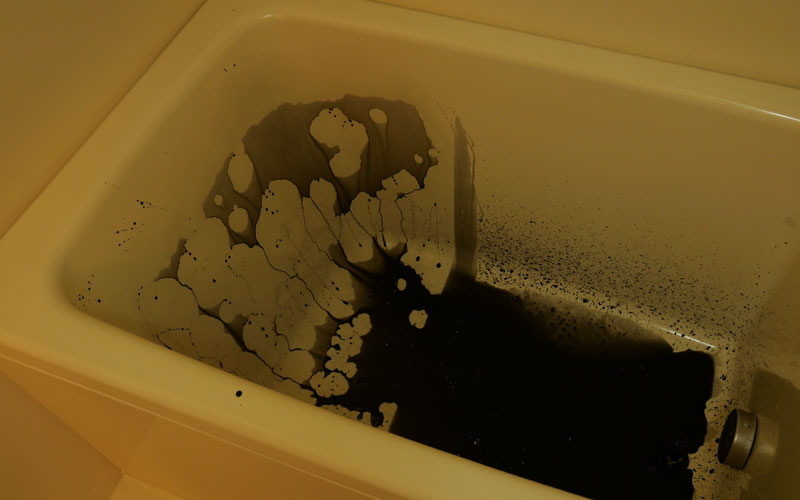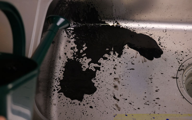 シンク同様、墨汁をかけてみます。これでどこを施工したか分かりますか? 水の動きを見たい方は、ぜひ動画をご覧ください。