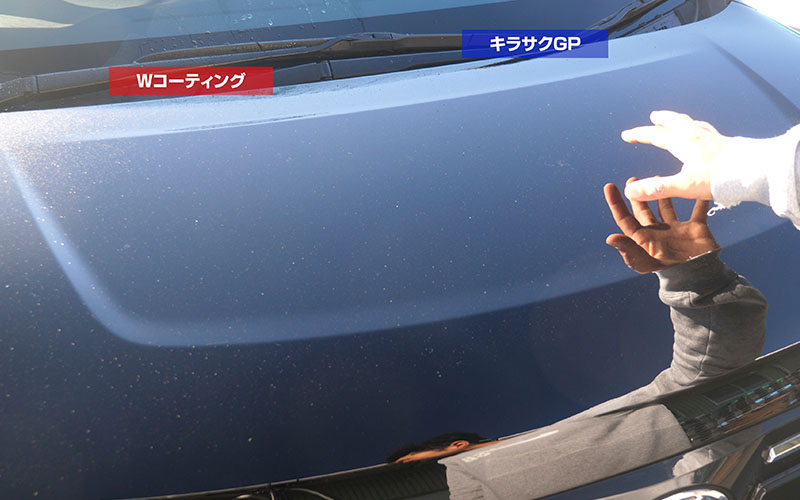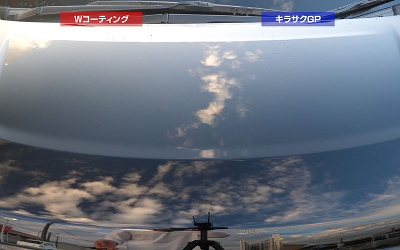 画面越しだとわかりづらいと思いますが、『キラサクGP』と未施工面にはマスキングテープの跡がハッキリ見えるのに対し、『Wコーティング』は未施工面と若干の差しかありません。