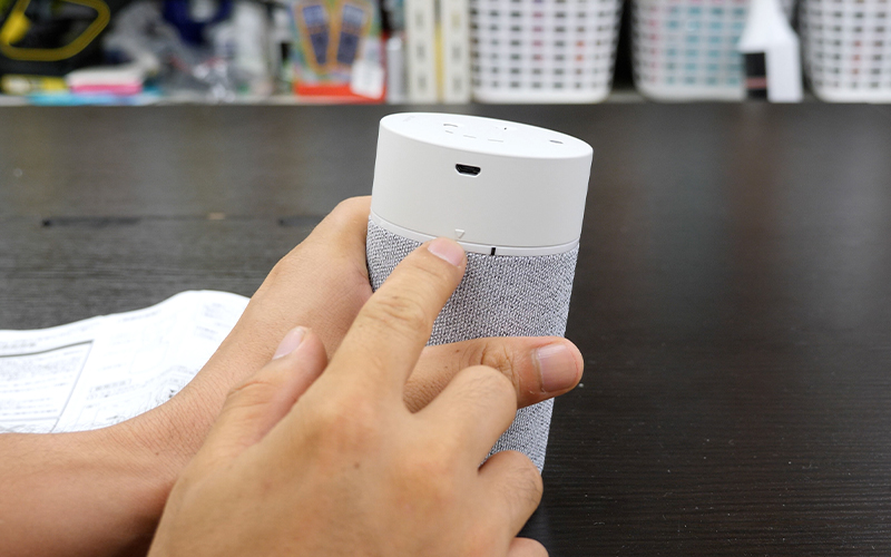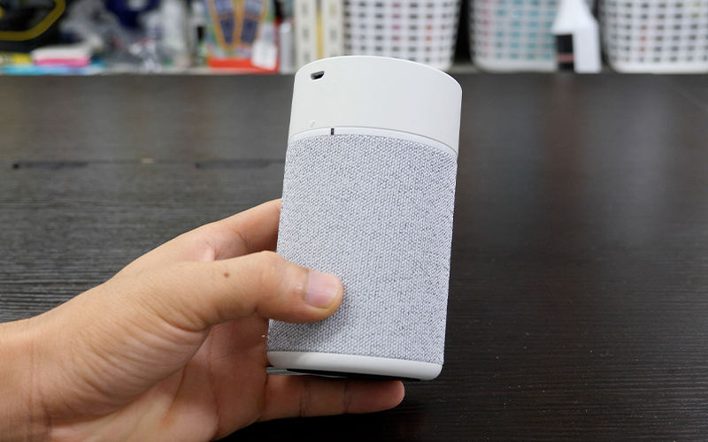 上部分は艶消し剤で塗ったような色合いで、灰色の部分がスピーカーのような質感の素材でできていて、底部分にはスポンジが付いていました。