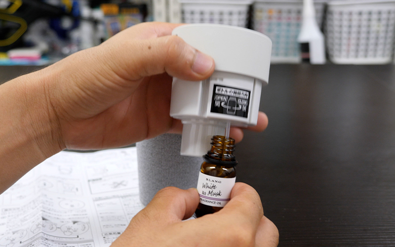 次に、専用のフレグランスオイルの蓋を外してさっき外した上部分と合わせるように重ねて回して固定していきます。