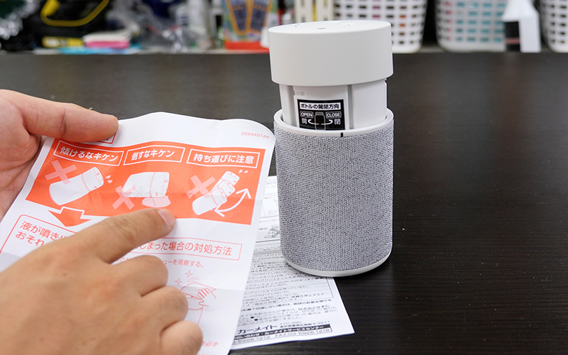 専用のフレグランスオイルを取り付けた状態で、傾けてしまった場合は作動させる前にティッシュを用意しティッシュで噴霧口を覆いレベル3で吹き出なくなるまで作動させ、その後に水拭きをする必要があるみたいです。