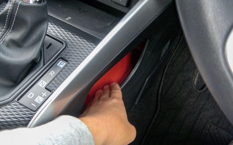 これはトヨタ車の場合多いのですが、もう少し車の内装全体を見て後ろにも配慮があればよかったのにと少し残念に思いました。僕が触れているコンソール付近の赤色の部分は小さな収納スペースでしたが、僕は何も収納できずにホコリなどを溜めてしまうスペースだと感じました。
