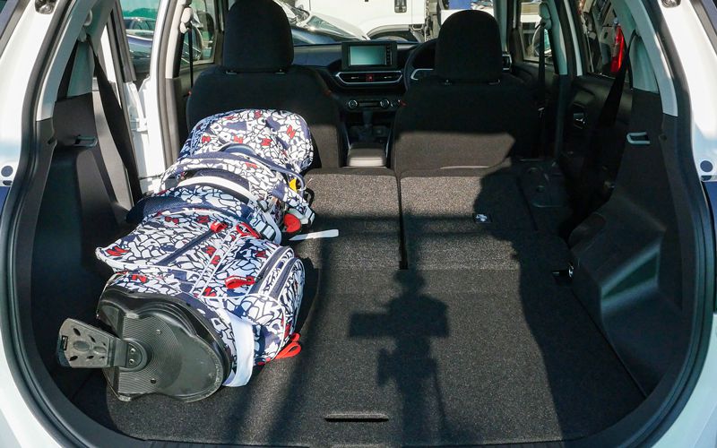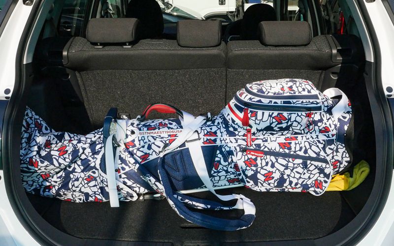 僕の予想では画像と同じようなサイズのゴルフバックなら2個ほどは横に詰めそうです。後部座席を前に倒して縦に積んでみました。先程の荷室のみで横に積んだ時より正直こちらの方が安心して積めました。