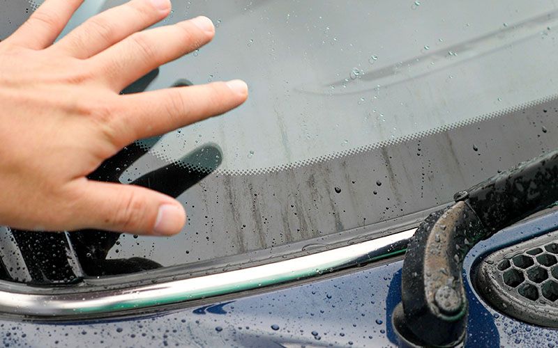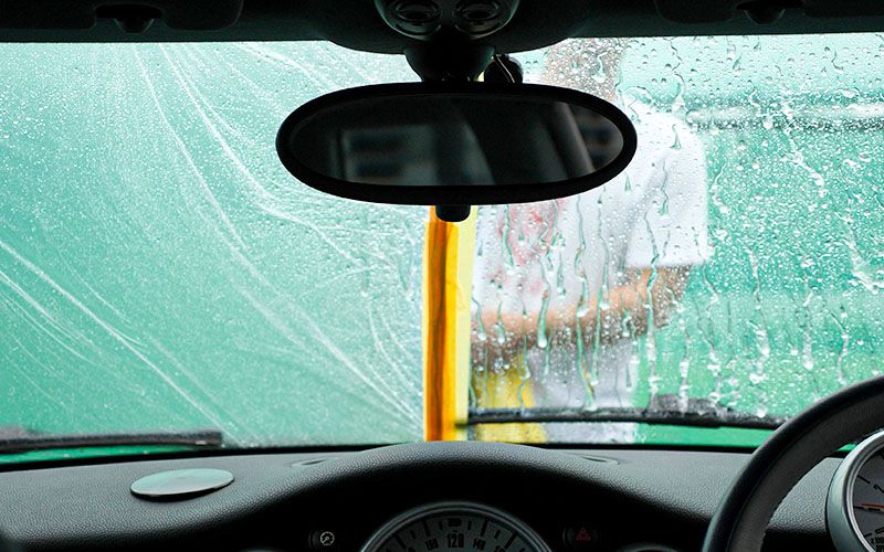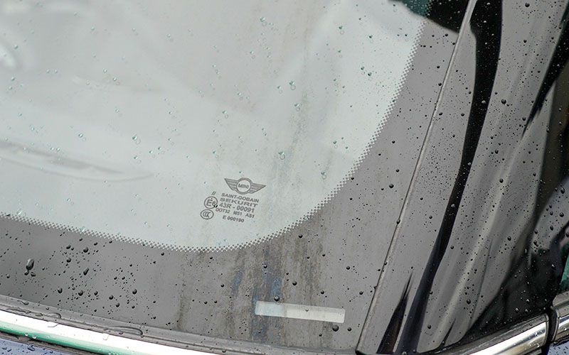 今回はこちらのフロントガラスに施工していきます。前に施工した撥水剤が残っているので、落とします。