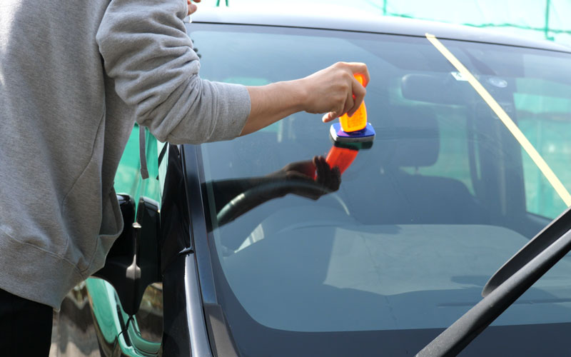 まずは、普段からよく使っている『ハイブリッドストロングα』を助手席側に施工していきます。メインは初めて紹介する『ガラコDX』なので、『ハイブリッドストロングα』はパパッと施工してきます。