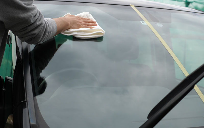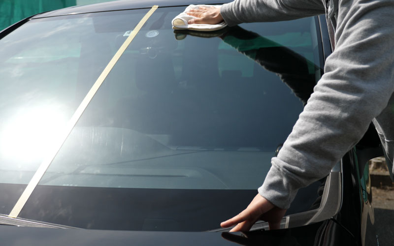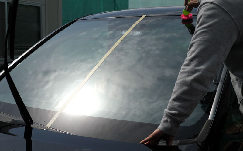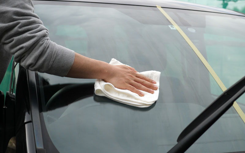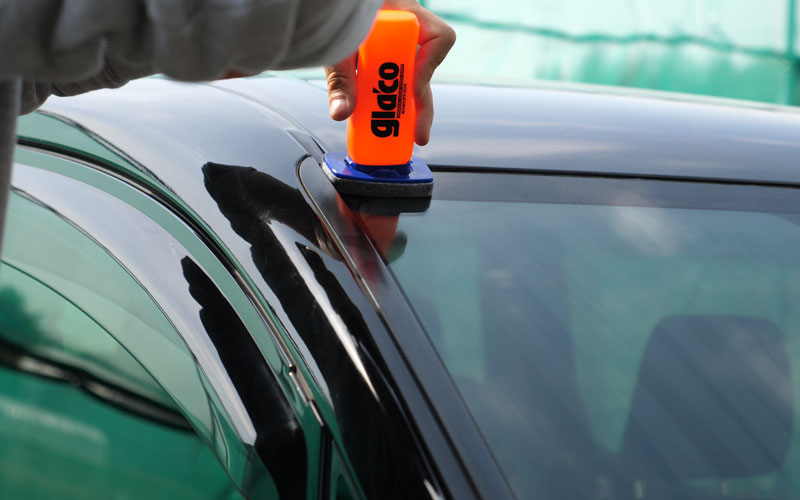 あと『ハイブリッドストロングα』はフェルト面が丸型なんです。この後に使用する『ガラコDX』は四角なんです。丸型だとガラス面の角が塗れないんです。