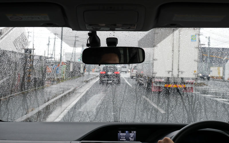 予報通り雨が降ってきたので、走行映像の撮影をしていきます。運転席側が『ガラコDX』で、助手席側が『ハイブリッドストロングα』になります。