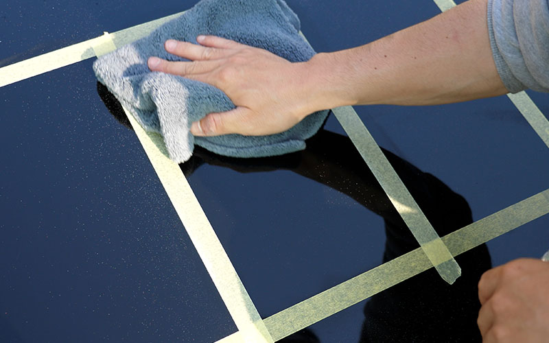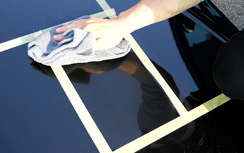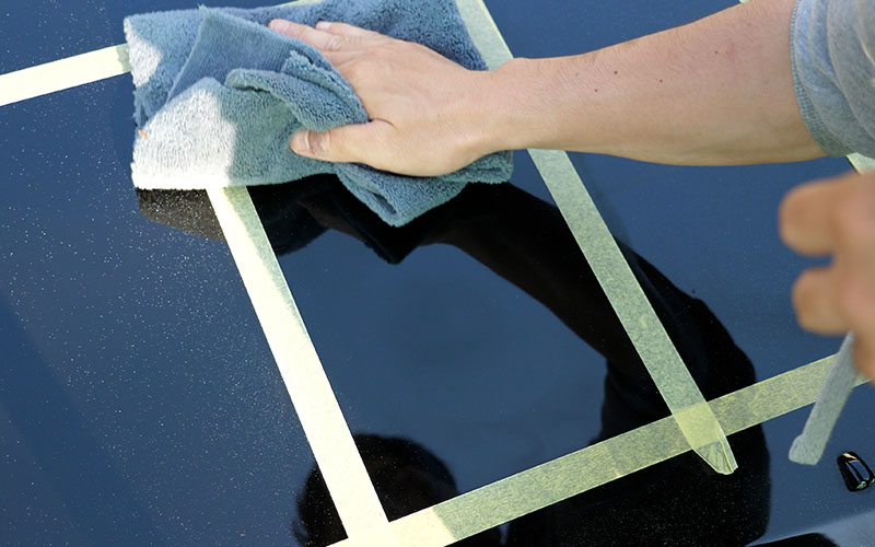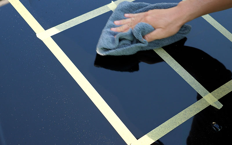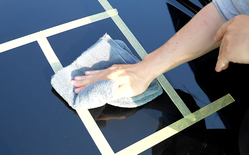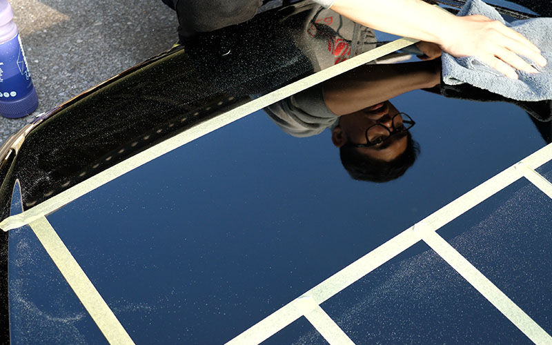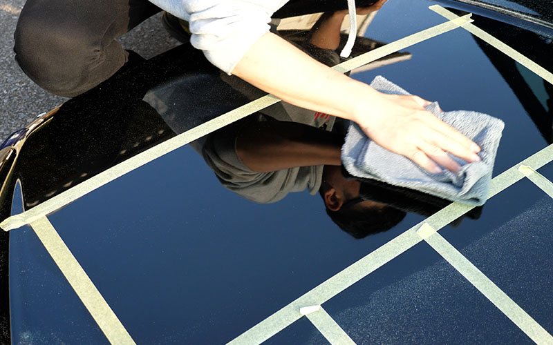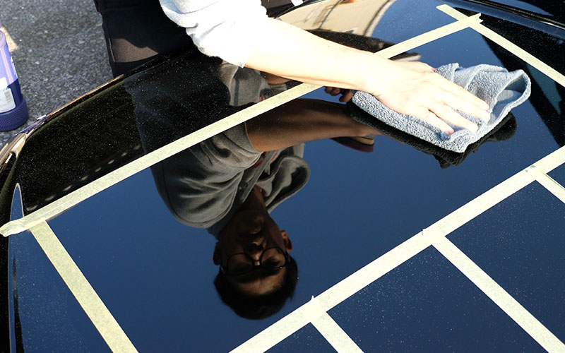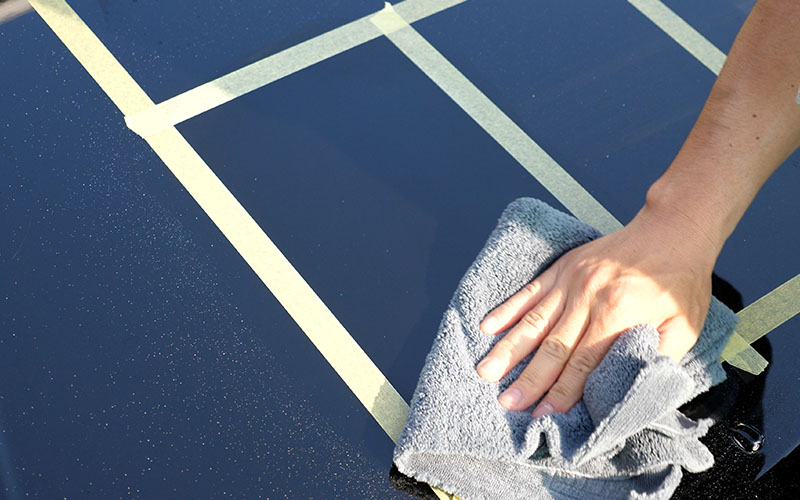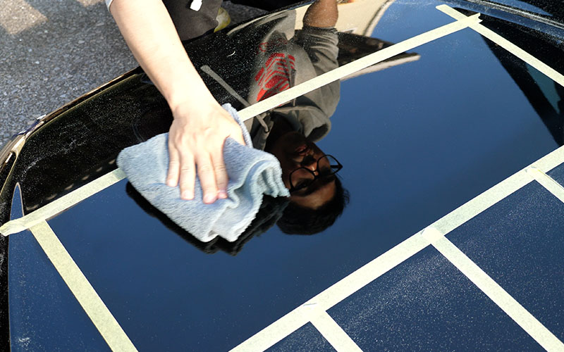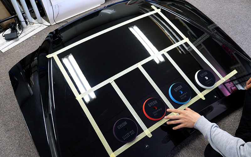 施工していくボンネットはよく実験に使っている17マジェのです。ボンネットにマスキングテープを貼ったので、マスキングテープの枠内をさらに4等分してテストをしていきたいなと思います!