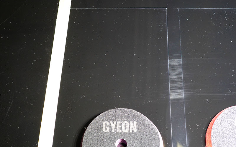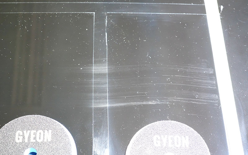 こんな感じでかなり傷は消えています。右と左の違いなんですが、左側の『ヘビーカット』でバフ掛けした方は、傷が深く入っていた分消え切れてないやつも中にはあります。