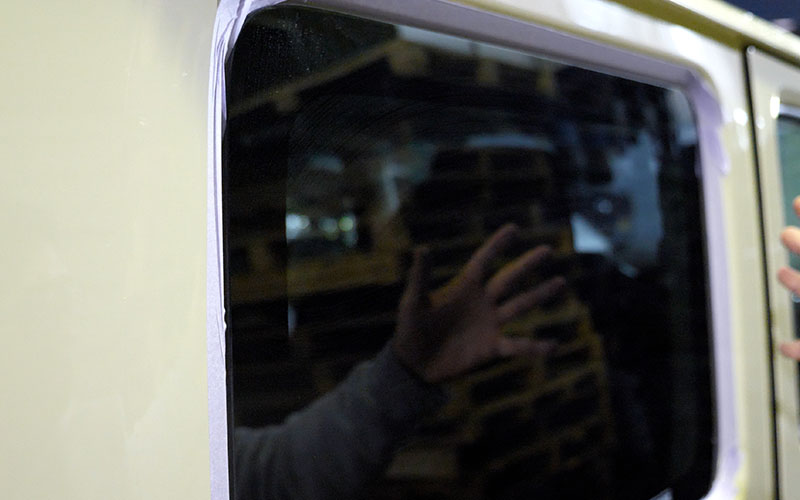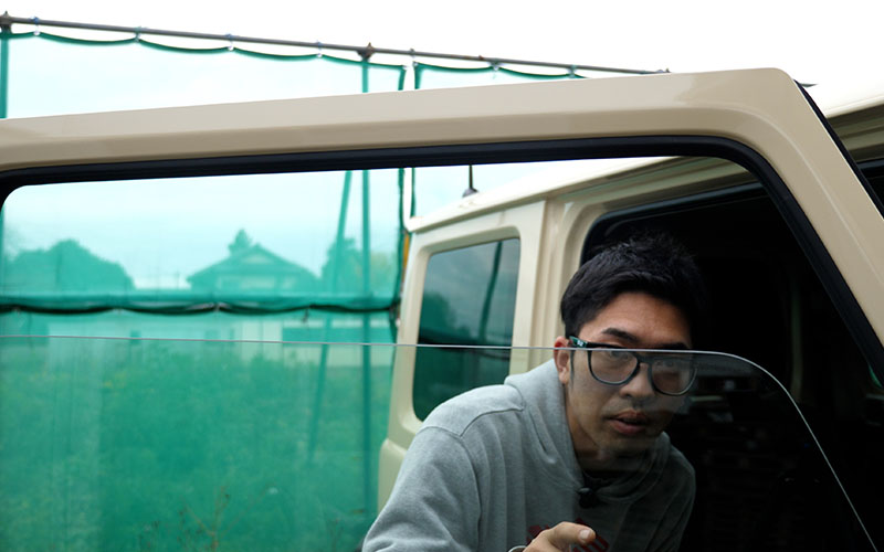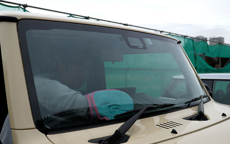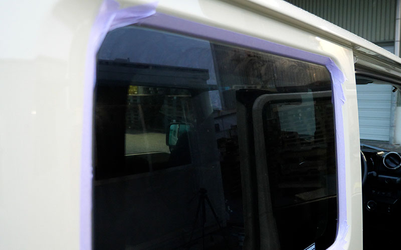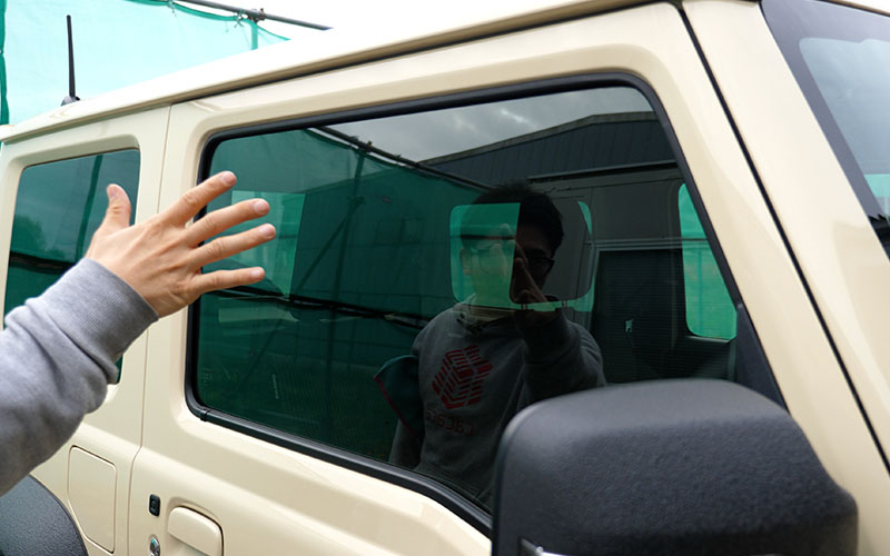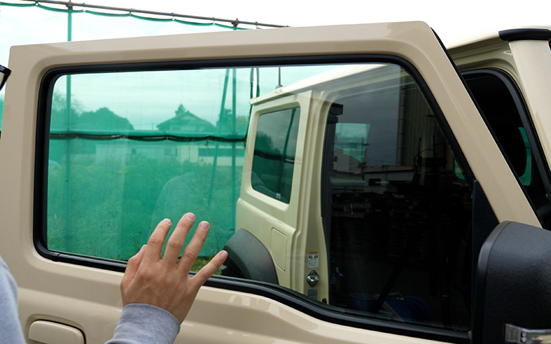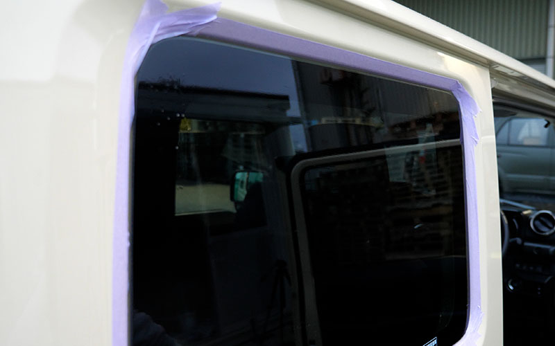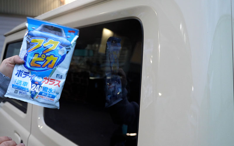 フロントガラスもやります。ジムニーシエラはフロントガラスが大きくてメチャメチャ拭きやすいですね!