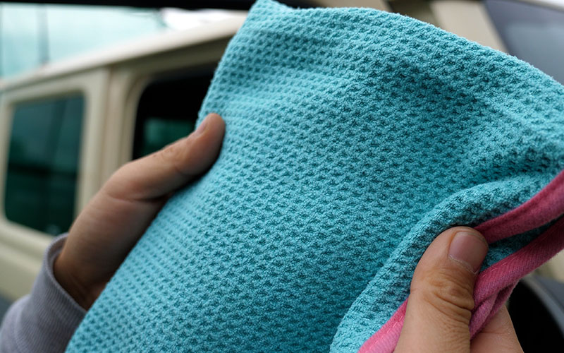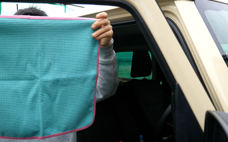 そして窓は毛が付かないクロスが望ましいので、僕はオートブライトダイレクトの『マリンガラスタオル』を使っています。ワッフルみたいな見た目で毛が全くでないのですごく楽です。
