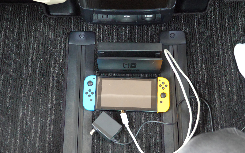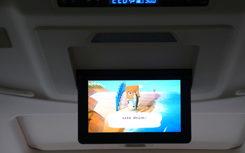 フリップダウンモニターの方は、純正品でHDMIの端子とAC100Vの電源がコンソールの裏まで来ていたので、テレビと同じようにニンテンドースイッチドックを使って映し出すことができました。