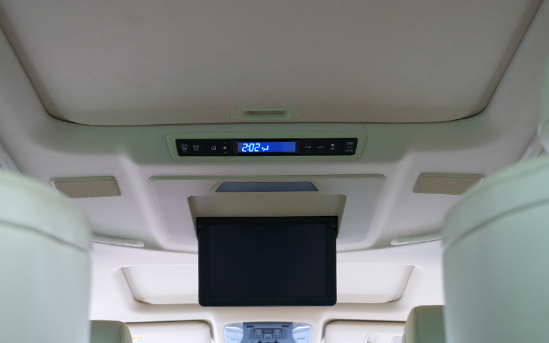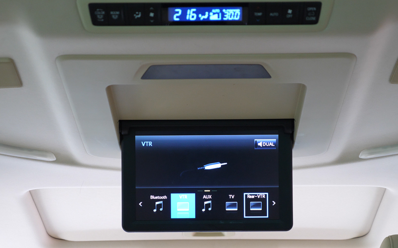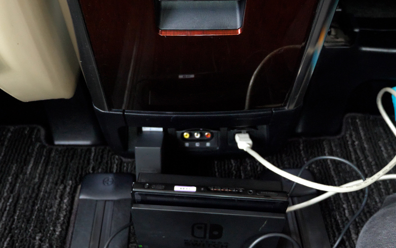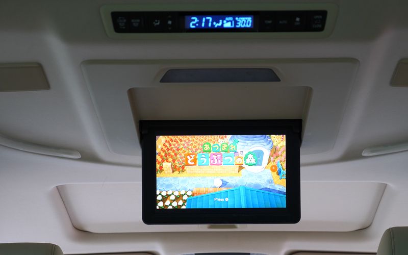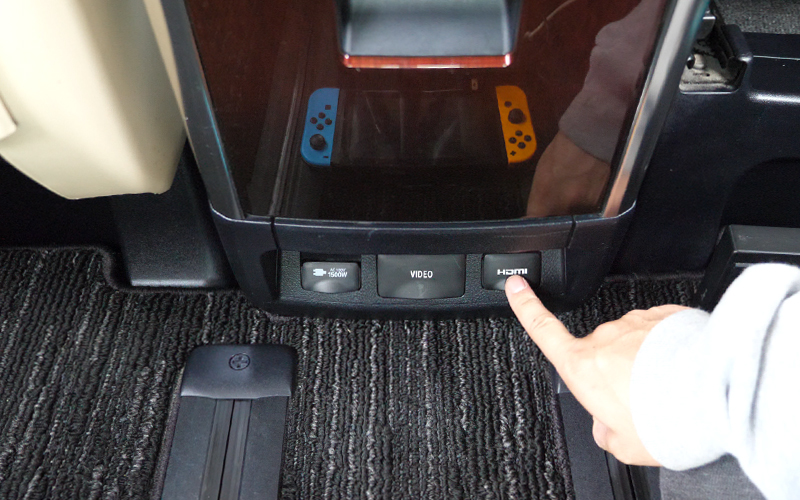 この車両に付いているフリップダウンモニターは純正のフリップダウンモニターで、センターコンソールの裏側に「AC100V」「VIDEO」「HDMI」の線があるので、新たに線を引いたりする必要もなく簡単にフリップダウンモニターにニンテンドースイッチの画面を映し出すことが可能です。