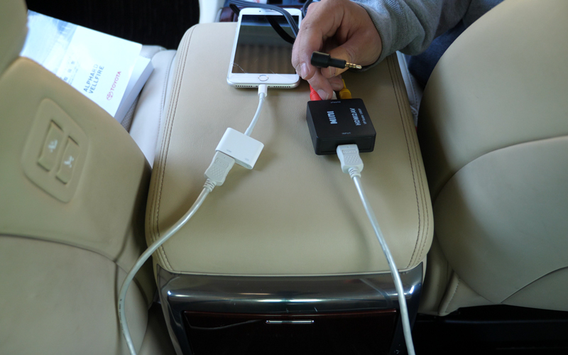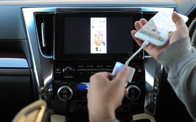 また、外部入力端子が違ければ他のもので変換する必要があります。逆に車両側がAUX端子じゃなくHDMI端子だったら変換する必要なく「HDMIケーブル」と「Apple Lightning – Digital AVアダプタ」だけでミラーリングすることが可能です。