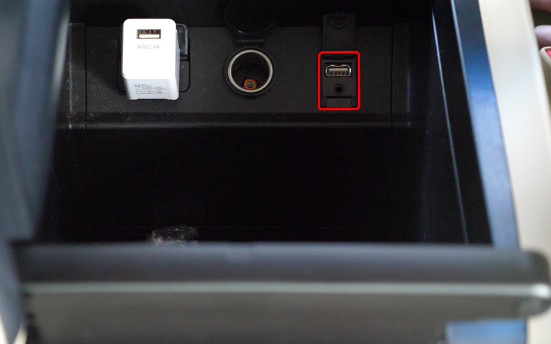 そのAUX端子がコンソールボックスの中にありました。(赤枠部分)
