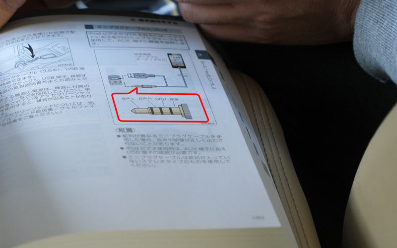取説には “AUX端子にポータブルオーディオなどの機器を接続して車両のスピーカーで聴いたり、VTR機器を接続して映像を見ることができます。” と記載されています。