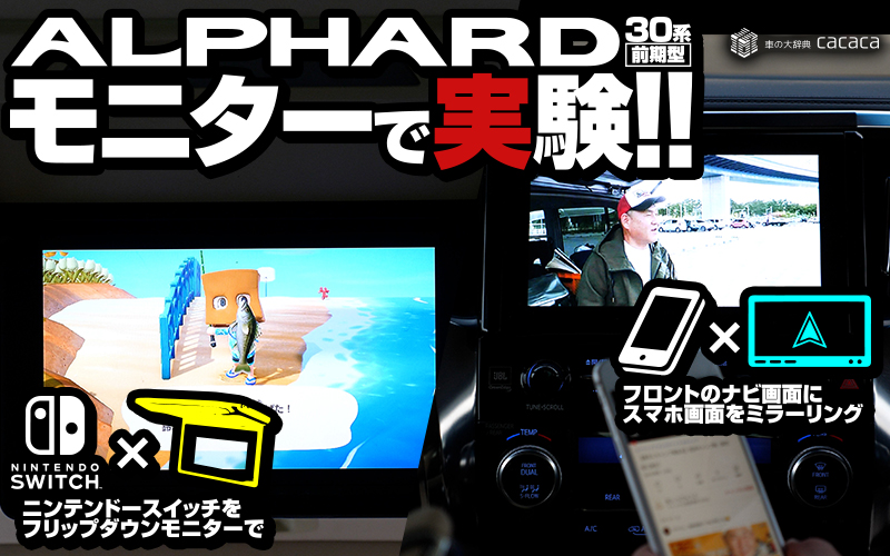 今回は30アルファード(前期)のフリップダウンモニター(純正品)に、ニンテンドースイッチの画面を映し出すのと、純正ナビにスマホの画面を映し出すことができるのかを検証してみました。