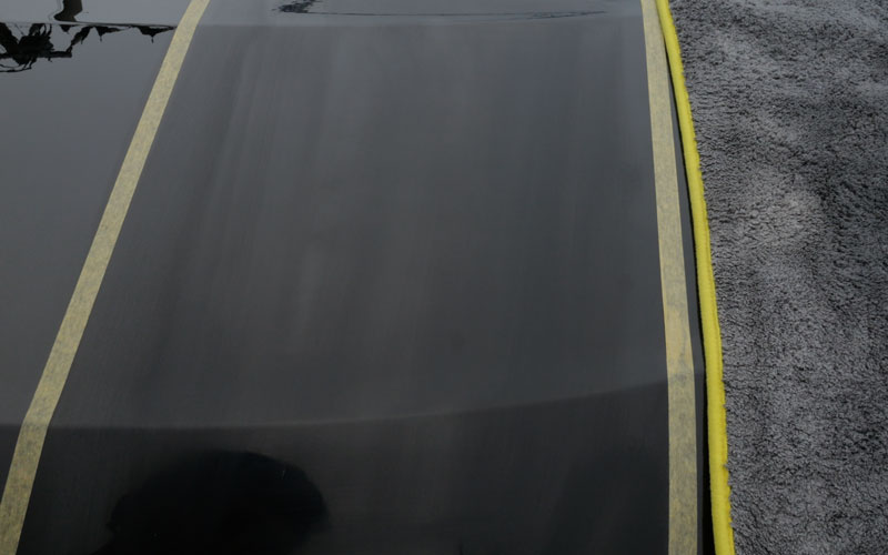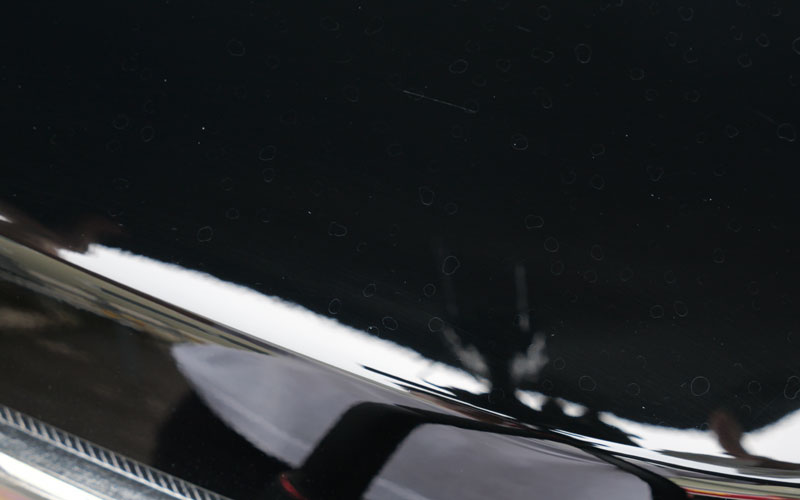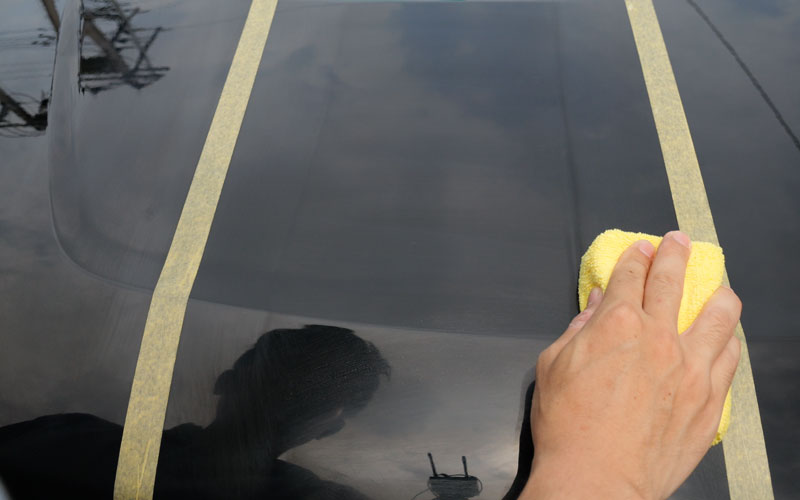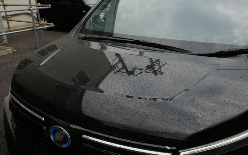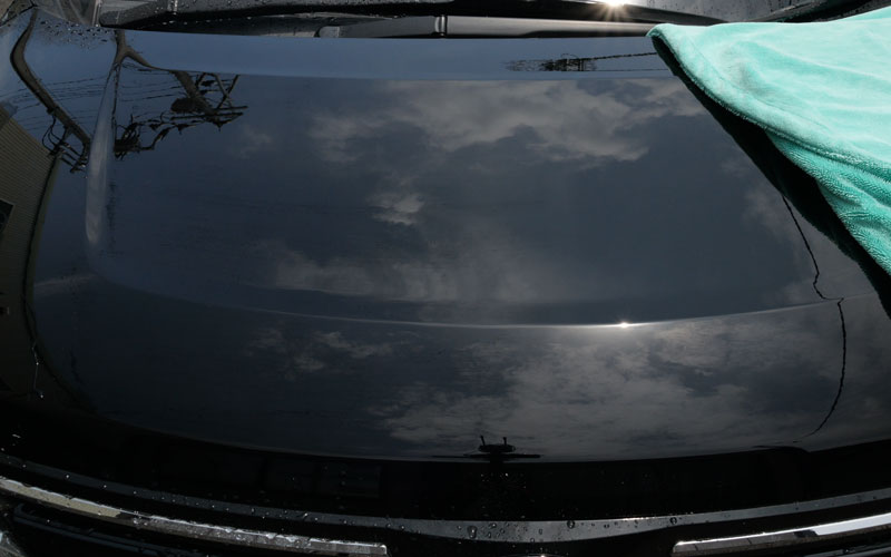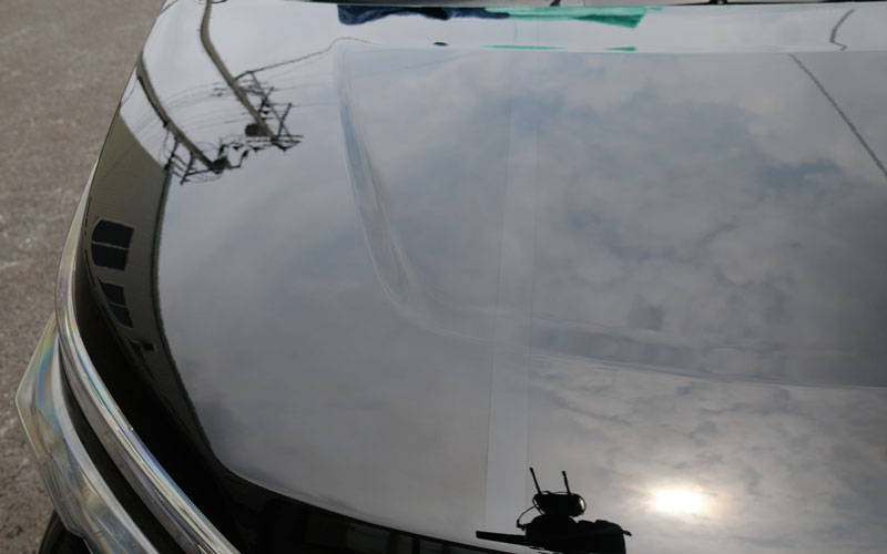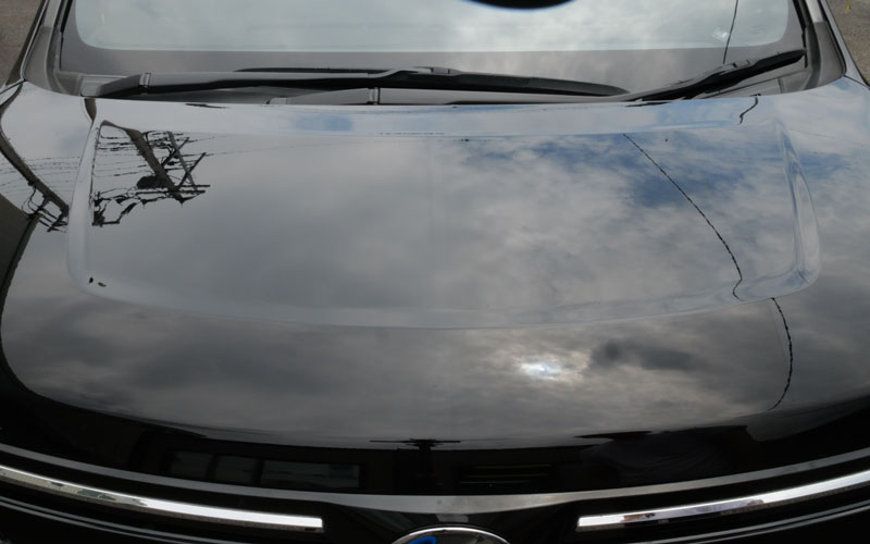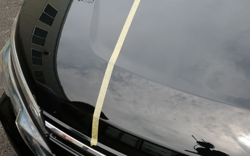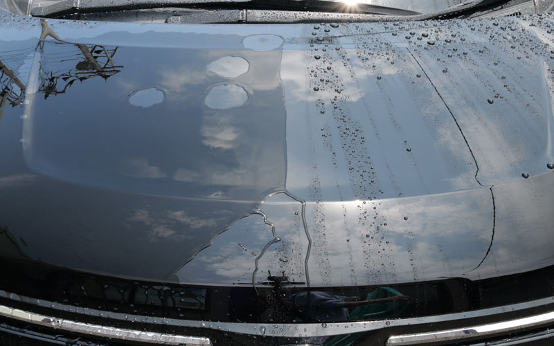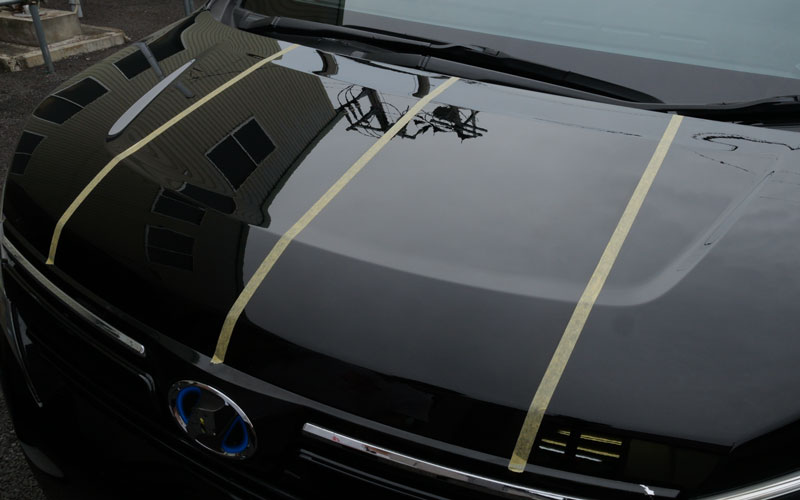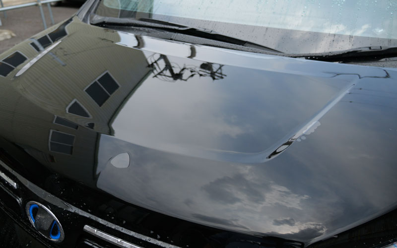こちらのボンネットに4商品全て施工してみようと思います。現状としては水がゆっくり引いていくような感じで何も乗っていない状態です。