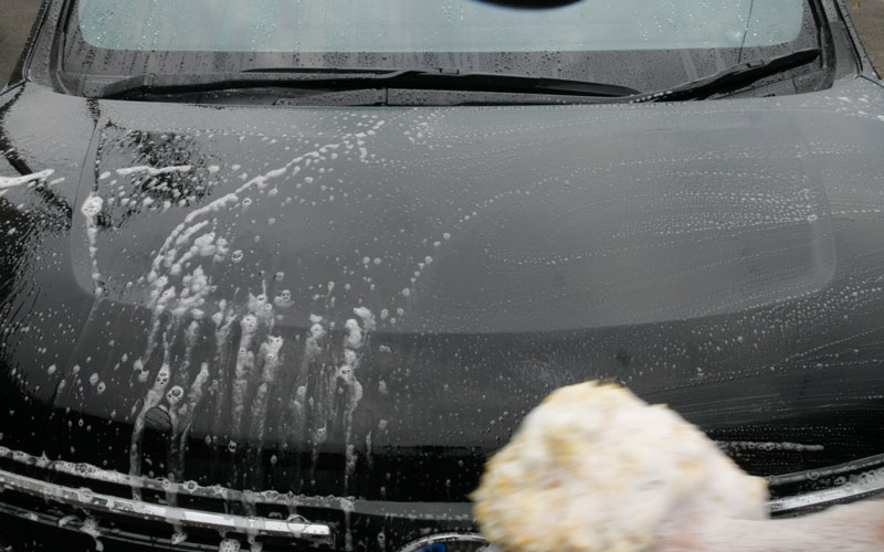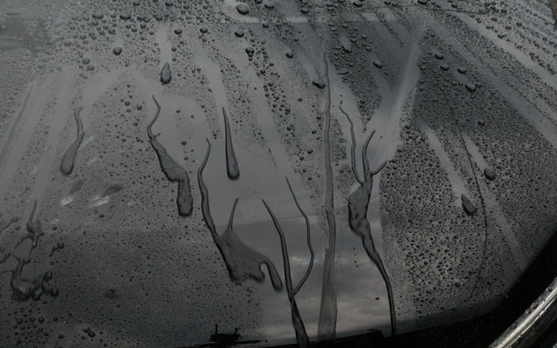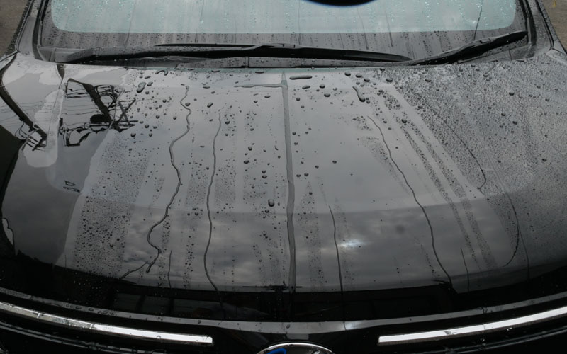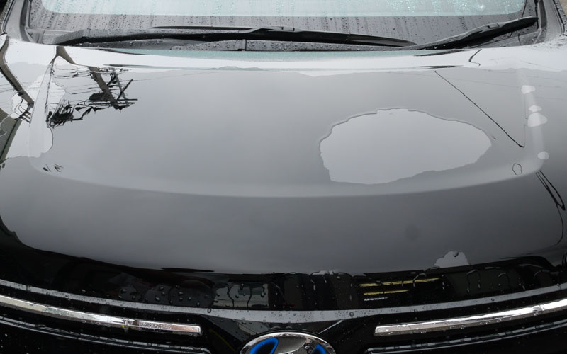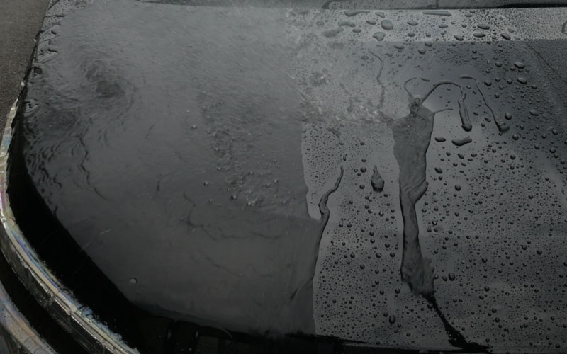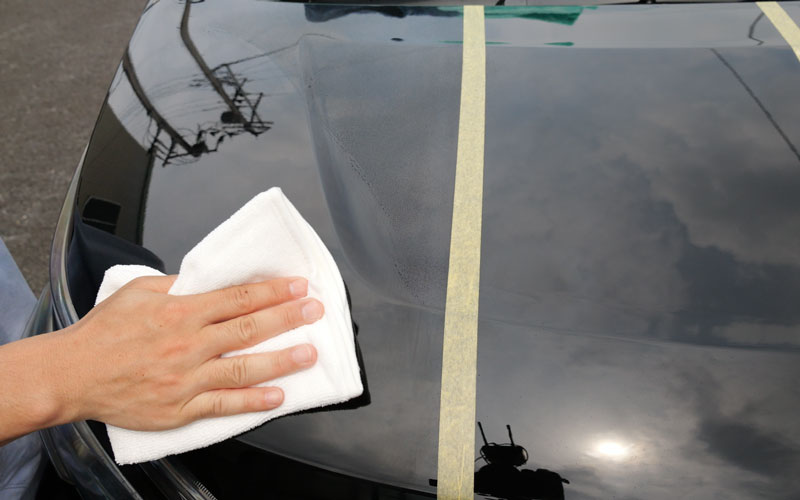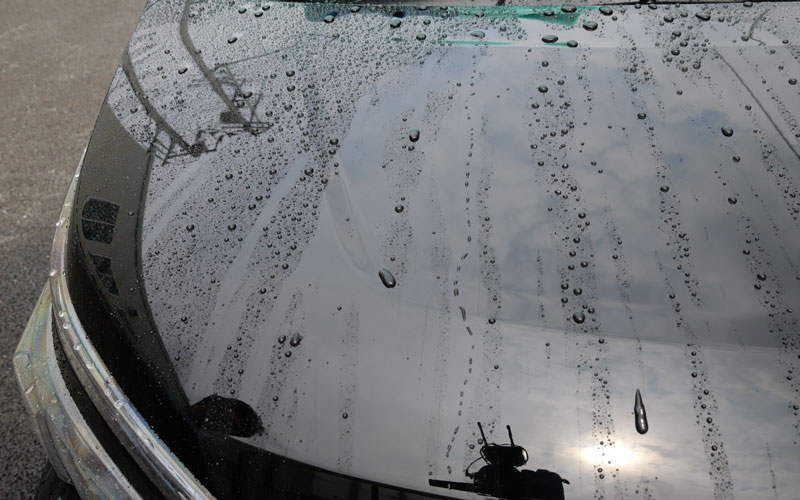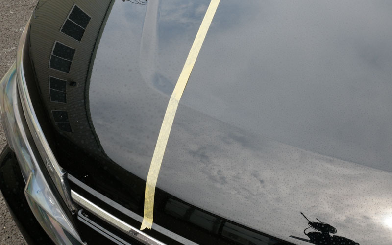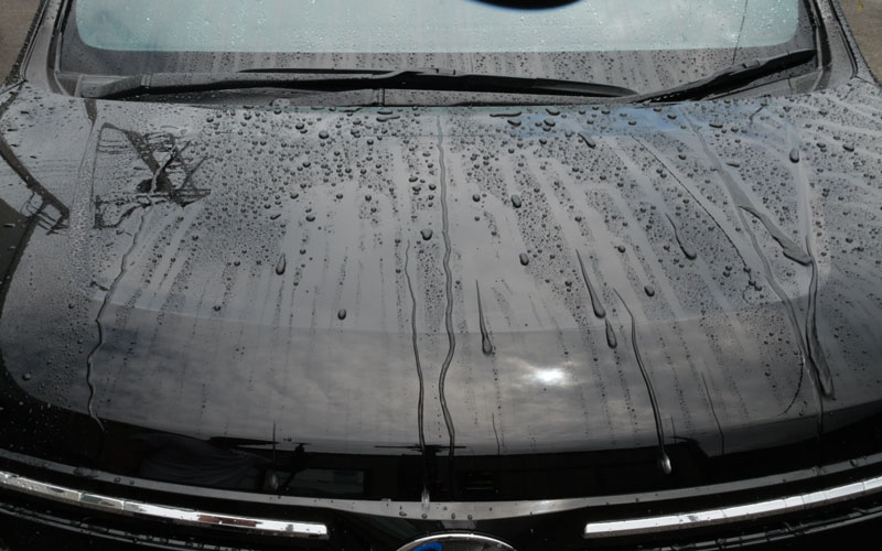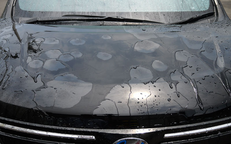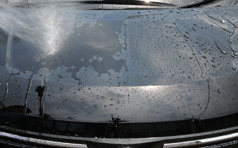 各商品を施工したボンネットに水道水をかけて、わざと乾かして水のシミを作ってみます。
