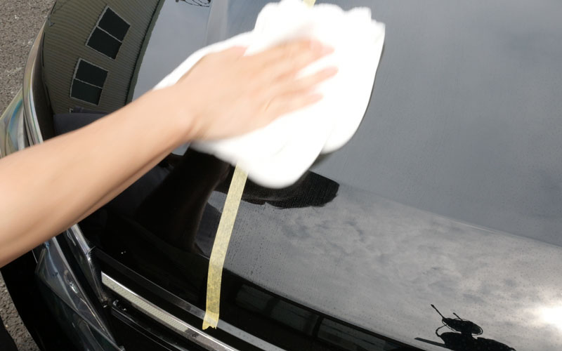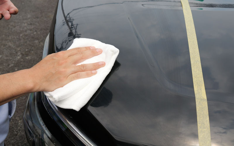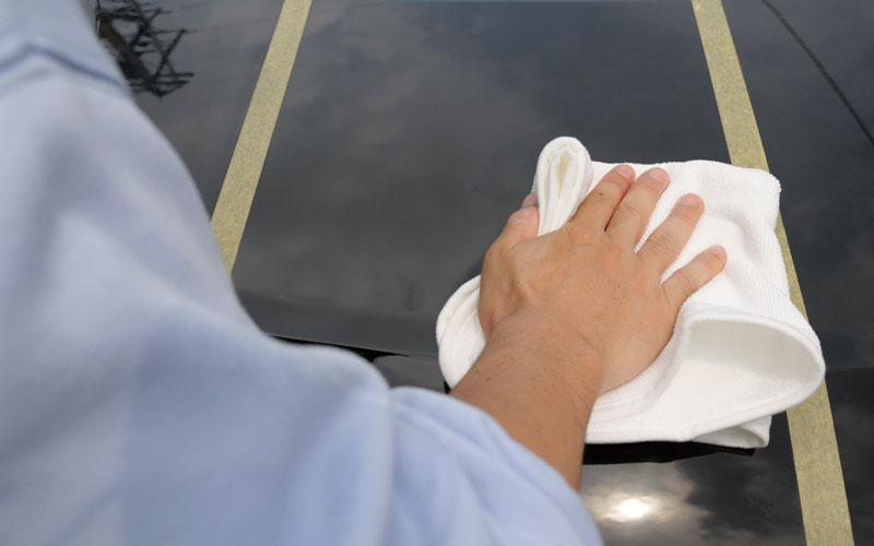 ① クロスに2~3回スプレーし、ボディに塗り広げます。この時完全に拭き取らずボディに本剤を残します。